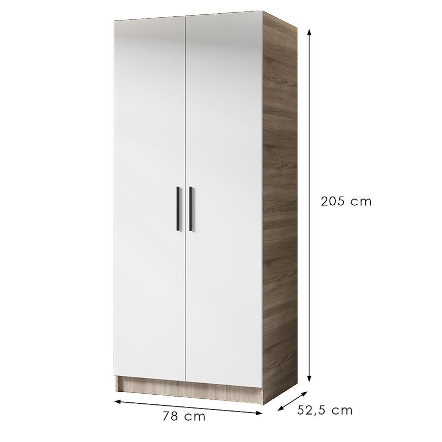 Szafa Gold 2d Dąb Sonoma/Biały to nowoczesny i funkcjonalny mebel, łączący elegancję z praktycznym designem. Posiada dwudrzwiową konstrukcję z klasycznymi drzwiami, oferując wygodną przestrzeń do przechowywania ubrań i dodatków. Wykonana z laminowanej płyty wiórowej, z frontami w białym macie i korpusem w odcieniu dąb sonoma, łączy trwałość z estetyką. Dzięki wymiarom 78 × 205 × 52,5 cm jest kompaktowa, praktyczna i idealnie wpisuje się w nowoczesne aranżacje wnętrz.