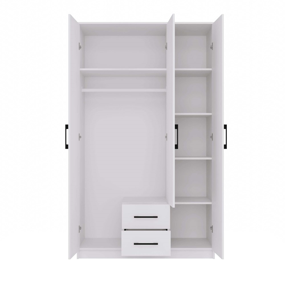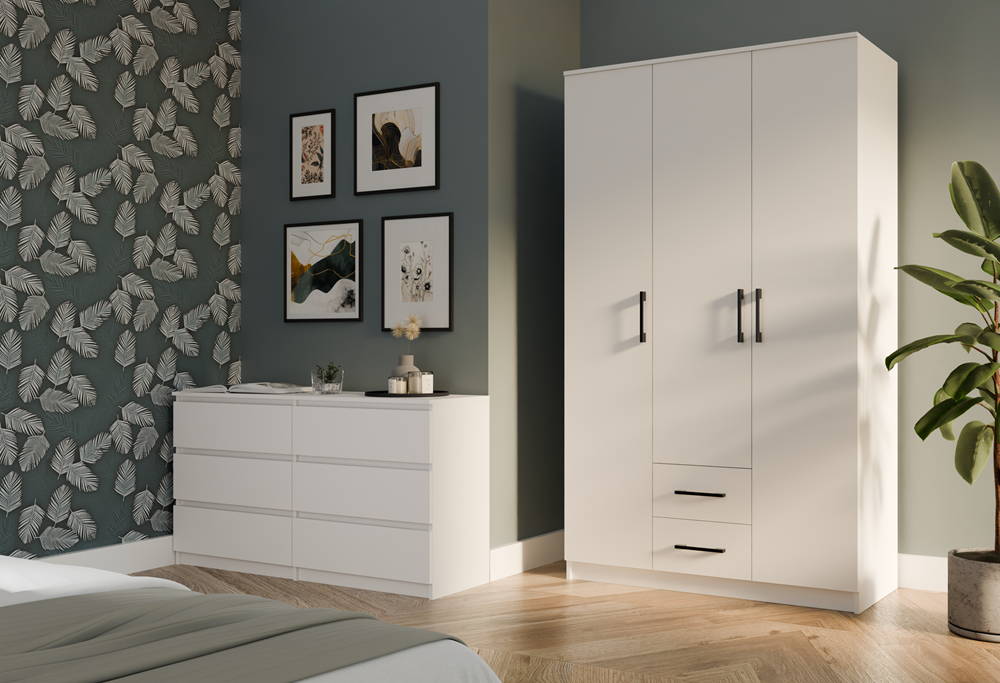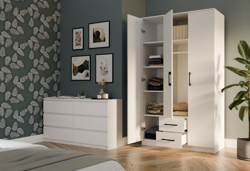 Szafa Graviola została zaprojektowana z myślą o maksymalnej wygodzie użytkownika. Wewnątrz znajdziesz drążek na wieszaki, idealny na koszule, marynarki i sukienki, a także pojemne półki na złożone ubrania, pudełka lub ręczniki. Dodatkowo, dwie dolne szuflady to praktyczna przestrzeń na bieliznę, dodatki lub inne drobiazgi, które chcesz mieć zawsze pod ręką.