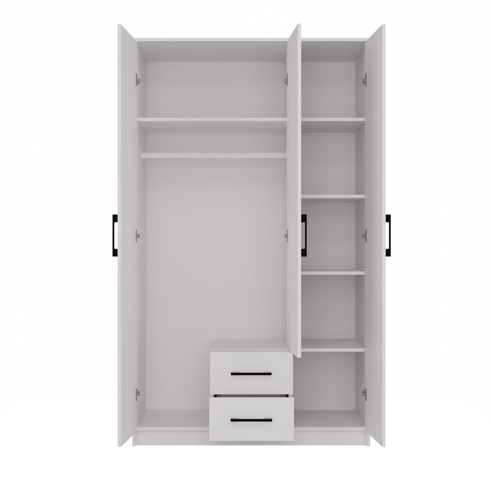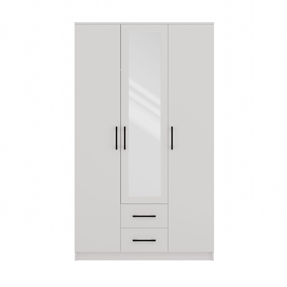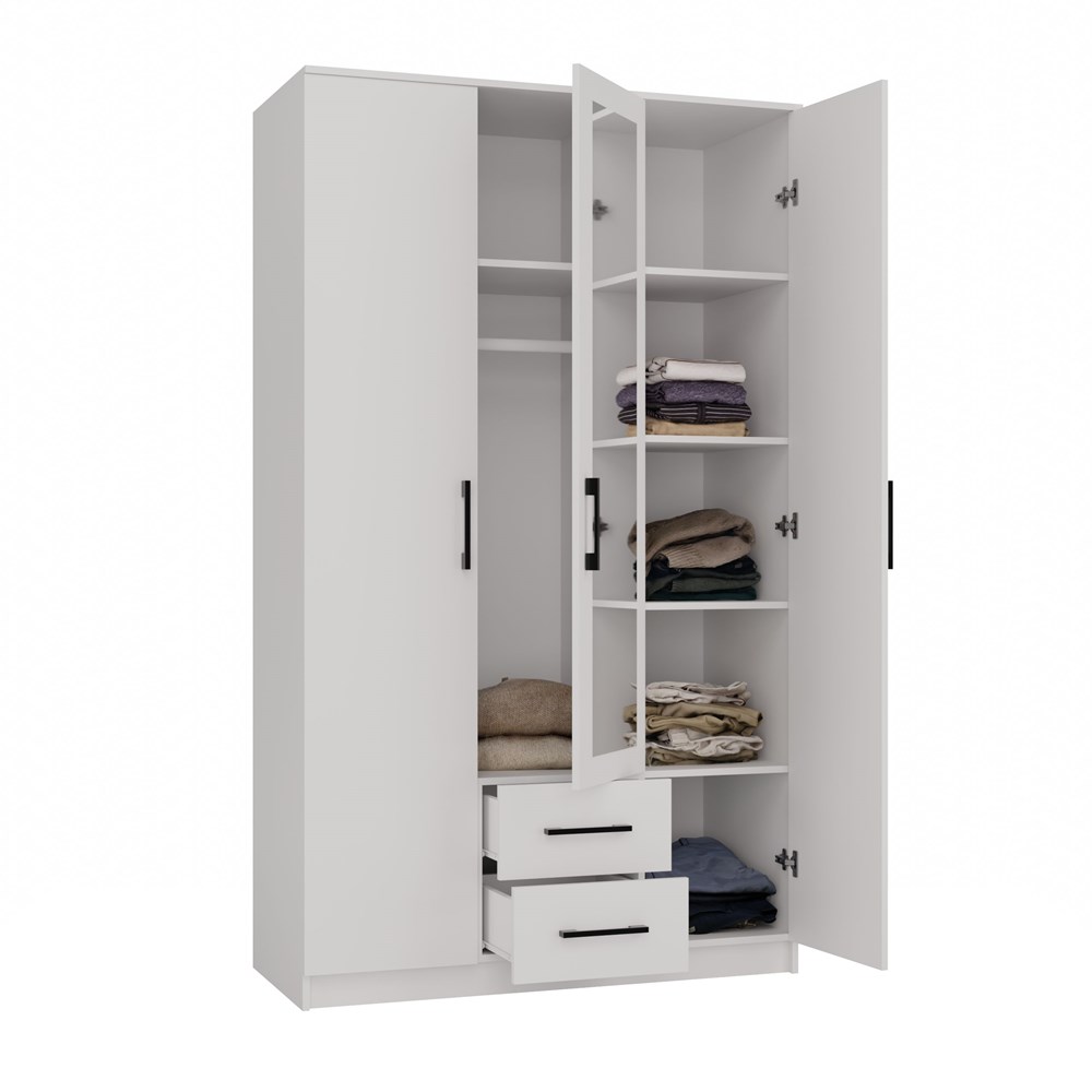 Szafa w kolorze białym z kolekcji Graviola to doskonała propozycja do pokoju dziennego, ale znajdzie swoje miejsce również w innym pomieszczeniu, jak na przykład - przedpokój czy garderobie, sypialni. Materiał wykonania to płyta laminowana. Szafa posiada drążek na ubrania oraz szuflady. Duża szafa posiada również lustro, które sprawi, że pomieszczenie stanie się optycznie większe. Mebel będzie świetnym miejscem do wieszania ubrań, na buty lub inne domowe tekstylia. Nowoczesny styl mebli wpadnie do gustu każdemu, kto poszukuje eleganckiego, klasycznego, a zarazem nowoczesnego umeblowania. Idealnie wpasuje się w większość aranżacji. Szafa przeznaczona do samodzielnego montażu.