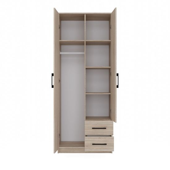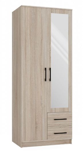 Szafa w kolorze dąb sonoma z kolekcji Graviola to doskonała propozycja do pokoju dziennego, ale znajdzie swoje miejsce również w innym pomieszczeniu, jak na przykład - przedpokój czy garderobie, sypialni. Materiał wykonania to płyta laminowana. Szafa posiada drążek na ubrania oraz szuflady. Duża szafa posiada również lustro, które sprawi, że pomieszczenie stanie się optycznie większe. Mebel będzie świetnym miejscem do wieszania ubrań, na buty lub inne domowe tekstylia. Nowoczesny styl mebli wpadnie do gustu każdemu, kto poszukuje eleganckiego, klasycznego, a zarazem nowoczesnego umeblowania. Idealnie wpasuje się w większość aranżacji. Szafa przeznaczona do samodzielnego montażu.