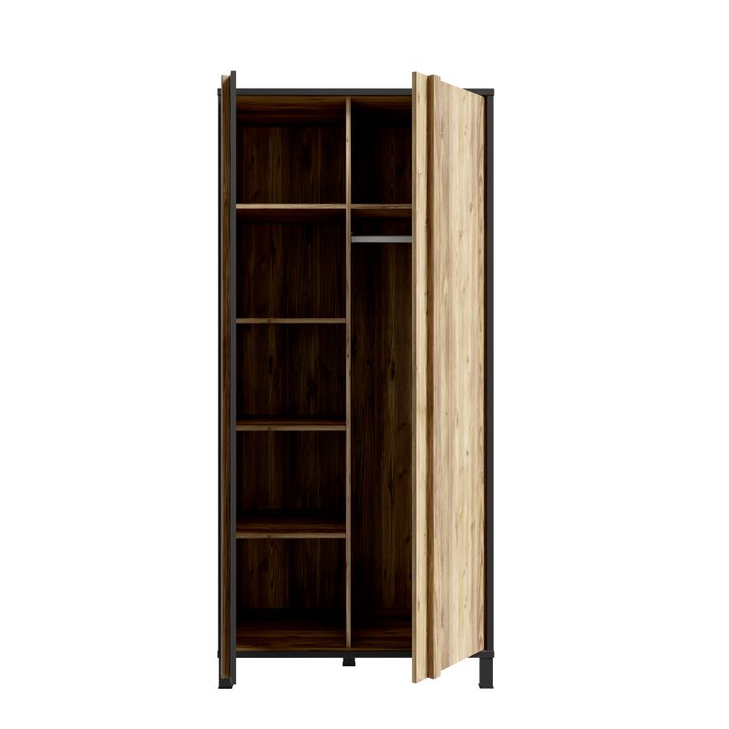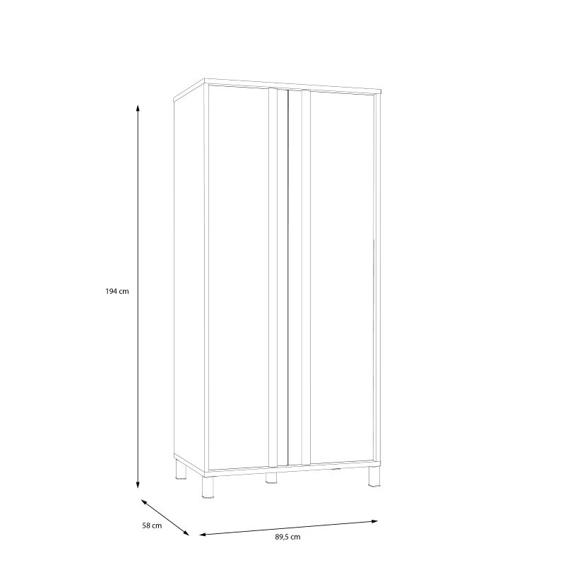 Ta dwudrzwiowa szafa jest niezwykle funkcjonalna, oferując użytkownikowi wiele możliwości przechowywania ubrań i akcesoriów. Wnętrze szafy zostało starannie zaprojektowane, aby sprostać różnorodnym potrzebom użytkowników. Na wieszaku umieszczonym w górnej części szafy można swobodnie rozwiesić ubrania, co ułatwia utrzymanie porządku w garderobie. Dodatkowo, pięć solidnych półek pozwala na uporządkowane przechowywanie składników garderoby, butów, czy innych drobiazgów.