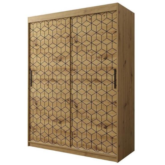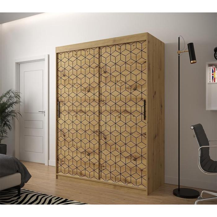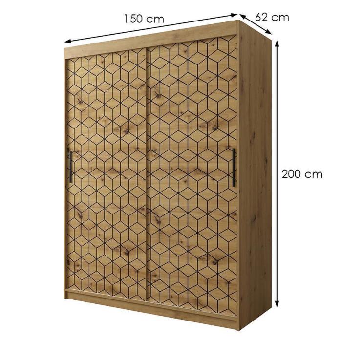 Szafa przesuwna Heksagon to propozycja do pokoju dziennego, ale znajdzie swoje miejsce również w innym pomieszczeniu, jak na przykład - przedpokój czy garderobie. Materiał wykonania to płyta wiórowa laminowana o grubości 16mm, tył szafy wykonany z płyty HDF. Krawędzie wykończenia odporną na uszkodzenia okleiną PCV 0,5 mm. Wzoru plastra wykonany techniką nadruku w kolorze czarnym. Szafa posiada półki oraz drążek na ubrania. Nowoczesny styl mebli wpadnie do gustu każdemu, kto poszukuje eleganckiego, klasycznego, a zarazem nowoczesnego umeblowania. Idealnie wpasuje się w większość aranżacji. Przeznaczona do samodzielnego montażu.