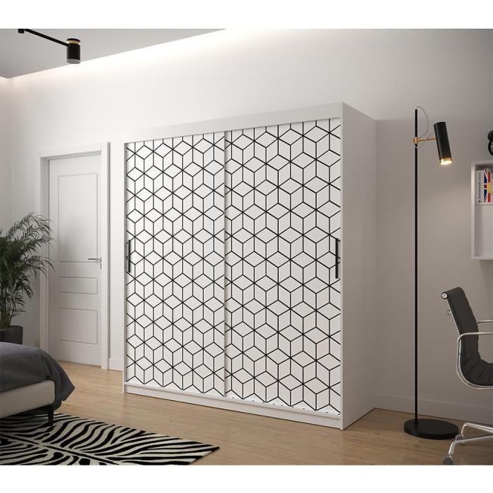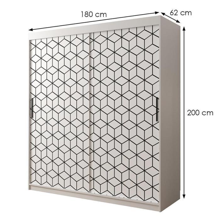 Szafa przesuwna Heksagon to propozycja do pokoju dziennego, ale znajdzie swoje miejsce również w innym pomieszczeniu, jak na przykład - przedpokój czy garderobie. Materiał wykonania to płyta wiórowa laminowana, tył szafy wykonany z płyty HDF. Wzoru plastra wykonany techniką nadruku w kolorze czarnym. Szafa posiada półki oraz drążek na ubrania. Nowoczesny styl mebli wpadnie do gustu każdemu, kto poszukuje eleganckiego, klasycznego, a zarazem nowoczesnego umeblowania. Idealnie wpasuje się w większość aranżacji. Przeznaczona do samodzielnego montażu.