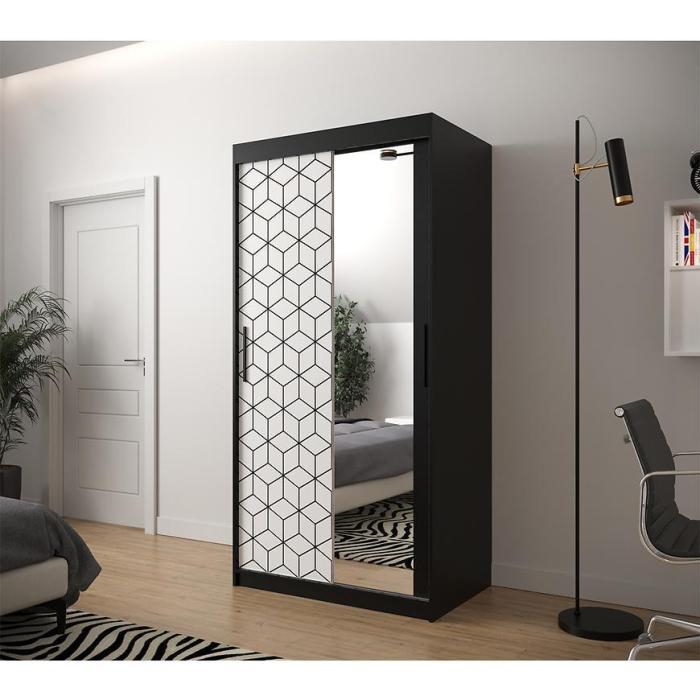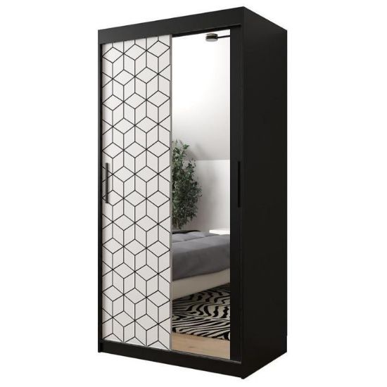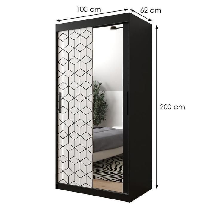Szafa przesuwna Heksagon to propozycja do pokoju dziennego, ale znajdzie swoje miejsce również w innym pomieszczeniu, jak na przykład - przedpokój czy garderobie. Materiał wykonania to płyta wiórowa laminowana. Wzoru plastra wykonany techniką nadruku w kolorze czarnym. Szafa posiada półki oraz drążek na ubrania. Szafa posiada również lustro, które sprawi, że pomieszczenie stanie się optycznie większe. Nowoczesny styl mebli wpadnie do gustu każdemu, kto poszukuje eleganckiego, klasycznego, a zarazem nowoczesnego umeblowania. Idealnie wpasuje się w większość aranżacji. Przeznaczona do samodzielnego montażu.