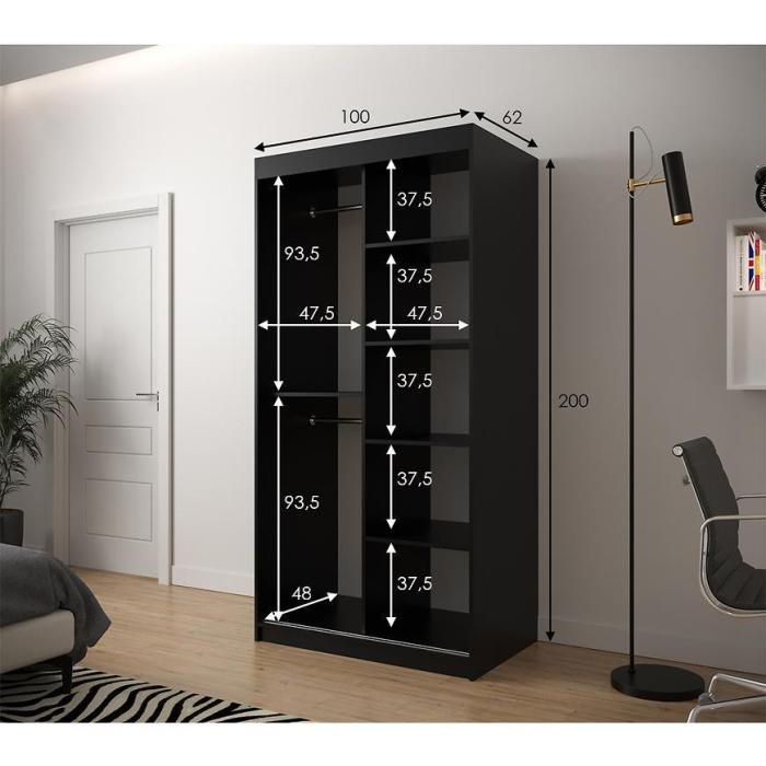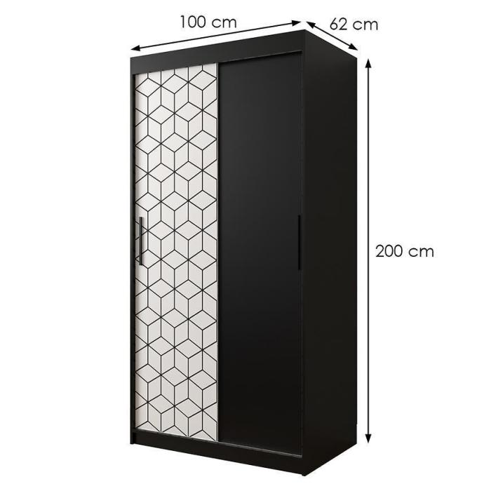 Szafa przesuwna Heksagon to propozycja do pokoju dziennego, ale znajdzie swoje miejsce również w innym pomieszczeniu, jak na przykład - przedpokój czy garderobie. Materiał wykonania to płyta wiórowa laminowana. Wzoru plastra wykonany techniką nadruku w kolorze czarnym. Krawędzie wykończenia odporną na uszkodzenia okleiną PCV 0,5 mm. Szafa posiada półki oraz drążek na ubrania. Nowoczesny styl mebli wpadnie do gustu każdemu, kto poszukuje eleganckiego, klasycznego, a zarazem nowoczesnego umeblowania. Idealnie wpasuje się w większość aranżacji. Przeznaczona do samodzielnego montażu.