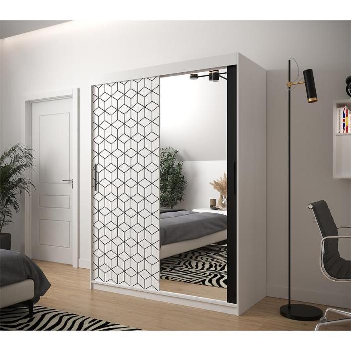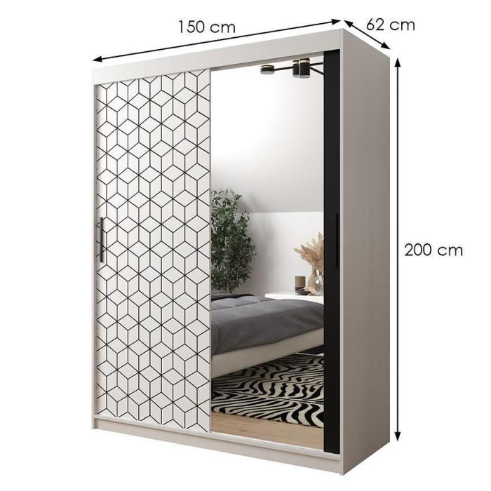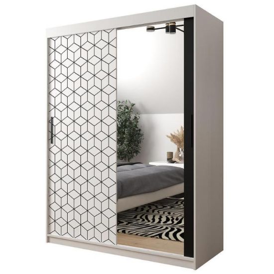 Szafa przesuwna Heksagon to propozycja do pokoju dziennego, ale znajdzie swoje miejsce również w innym pomieszczeniu, jak na przykład - przedpokój czy garderobie. Materiał wykonania to płyta wiórowa laminowana. Wzoru plastra wykonany techniką nadruku w kolorze czarnym. Szafa posiada półki oraz drążek na ubrania. Szafa posiada również lustro, które sprawi, że pomieszczenie stanie się optycznie większe. Nowoczesny styl mebli wpadnie do gustu każdemu, kto poszukuje eleganckiego, klasycznego, a zarazem nowoczesnego umeblowania. Idealnie wpasuje się w większość aranżacji. Przeznaczona do samodzielnego montażu.