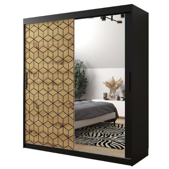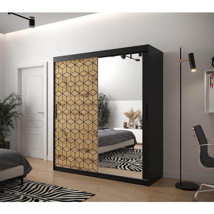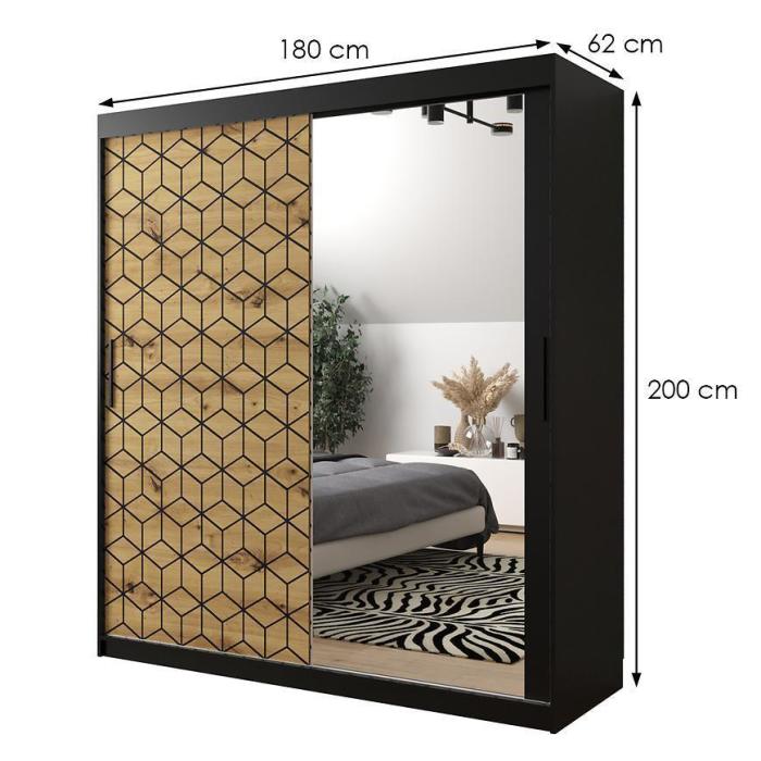 Szafa przesuwna Heksagon to propozycja do pokoju dziennego, ale znajdzie swoje miejsce również w innym pomieszczeniu, jak na przykład - przedpokój czy garderobie. Materiał wykonania to płyta wiórowa laminowana. Wzoru plastra wykonany techniką nadruku w kolorze czarnym. Szafa posiada półki oraz drążek na ubrania. Duża szafa posiada również lustro, które sprawi, że pomieszczenie stanie się optycznie większe. Nowoczesny styl mebli wpadnie do gustu każdemu, kto poszukuje eleganckiego, klasycznego, a zarazem nowoczesnego umeblowania. Idealnie wpasuje się w większość aranżacji. Przeznaczona do samodzielnego montażu.