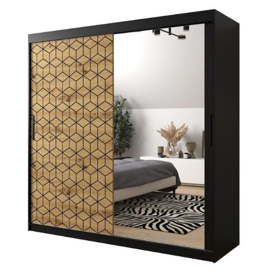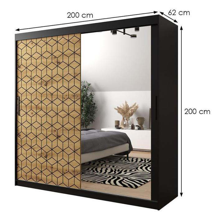 Szafa przesuwna Heksagon to propozycja do pokoju dziennego, ale znajdzie swoje miejsce również w innym pomieszczeniu, jak na przykład - przedpokój czy garderobie. Materiał wykonania to płyta wiórowa laminowana. Wzoru plastra wykonany techniką nadruku w kolorze czarnym. Szafa posiada półki oraz drążek na ubrania. Duża szafa posiada również lustro, które sprawi, że pomieszczenie stanie się optycznie większe. Nowoczesny styl mebli wpadnie do gustu każdemu, kto poszukuje eleganckiego, klasycznego, a zarazem nowoczesnego umeblowania. Idealnie wpasuje się w większość aranżacji. Przeznaczona do samodzielnego montażu.