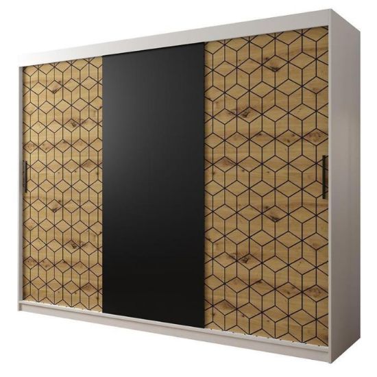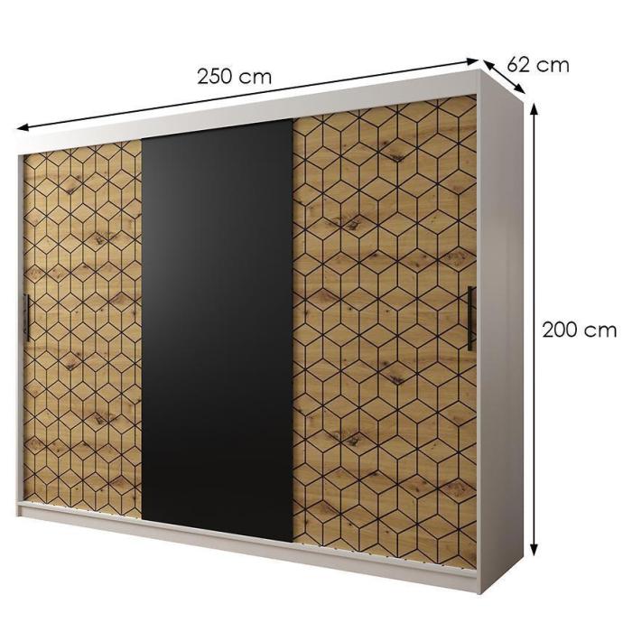 Szafa przesuwna Heksagon to propozycja do pokoju dziennego, ale znajdzie swoje miejsce również w innym pomieszczeniu, jak na przykład - przedpokój czy garderobie. Materiał wykonania to płyta wiórowa laminowana. Szafa posiada półki oraz drążek na ubrania. Nowoczesny styl mebli wpadnie do gustu każdemu, kto poszukuje eleganckiego, klasycznego, a zarazem nowoczesnego umeblowania. Idealnie wpasuje się w większość aranżacji. Przeznaczona do samodzielnego montażu.