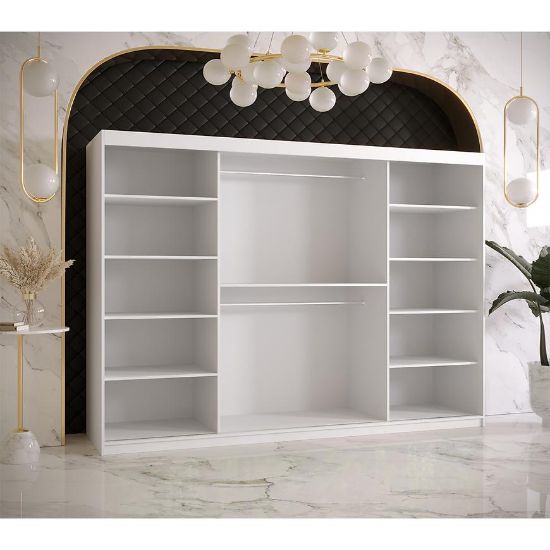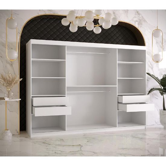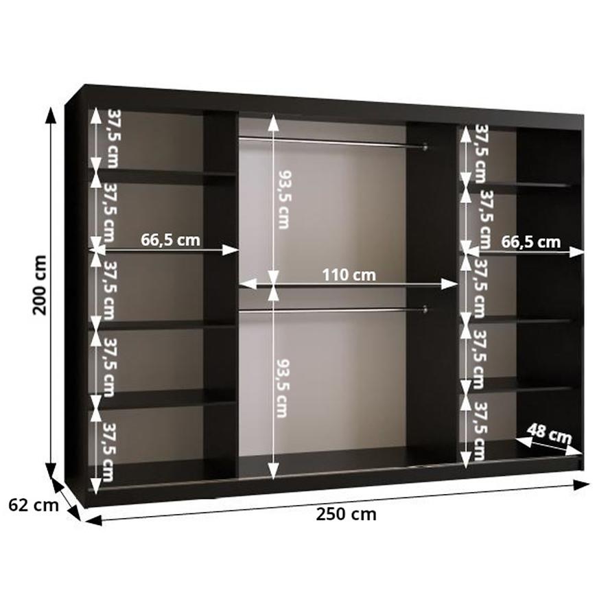 Co wyróżnia tę szafę spośród innych to oryginalny wzór, który nie jest jedynie naklejką. Dbałość o szczegóły i wysoka jakość wykonania są widoczne na każdym etapie produkcji. Prowadnice aluminiowe oraz uchwyty z tworzywa sztucznego w czarnym kolorze zapewniają płynne i ciche przesuwanie drzwi, podkreślając ergonomiczność mebla.