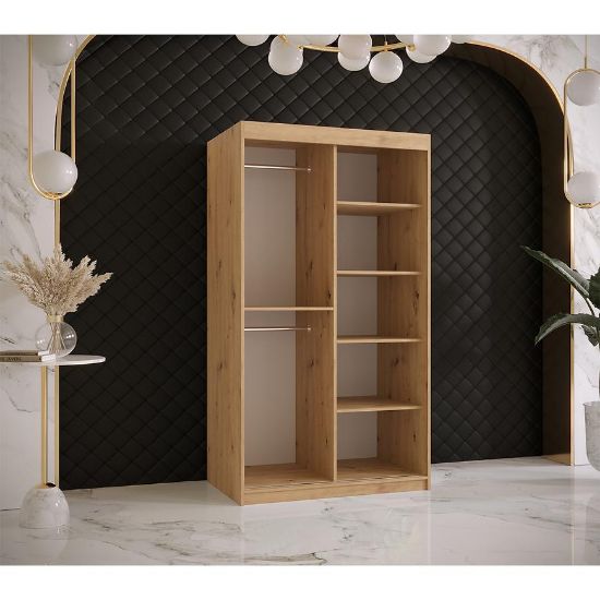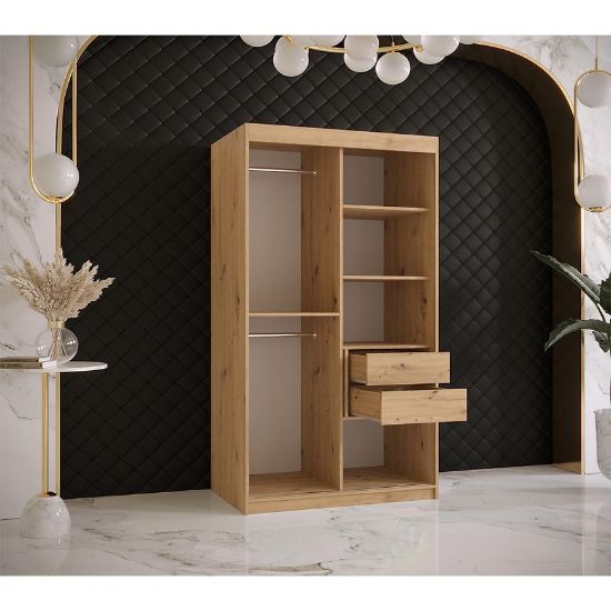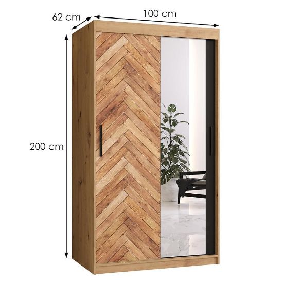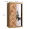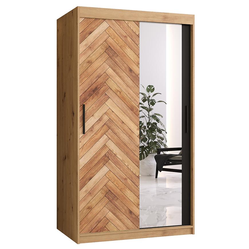 Konstrukcja szafy, wykonana jest z płyty laminowanej o grubości 16 mm, gwarantuje trwałość i stabilność. Fronty drzwi w eleganckim kolorze dąb artisan oraz lustro, nadają szafie HERRINGBONE wyjątkowego uroku, tworząc kontrastowy i harmonijny design. Matowe wykończenie dodaje meblowi subtelnego charakteru, podkreślając jego retro styl.