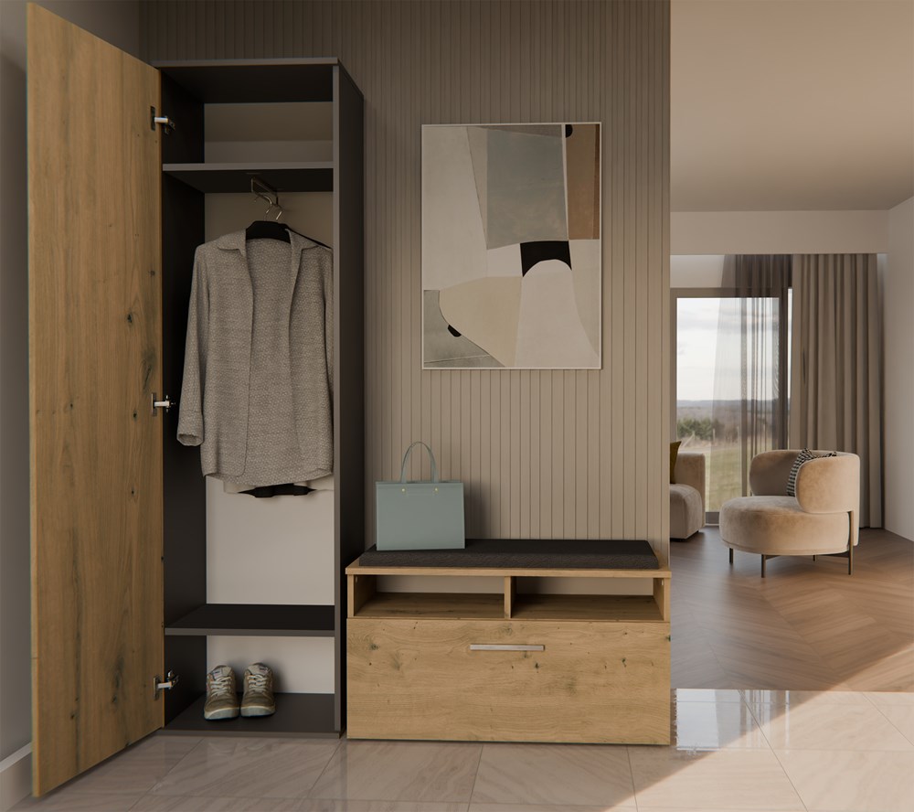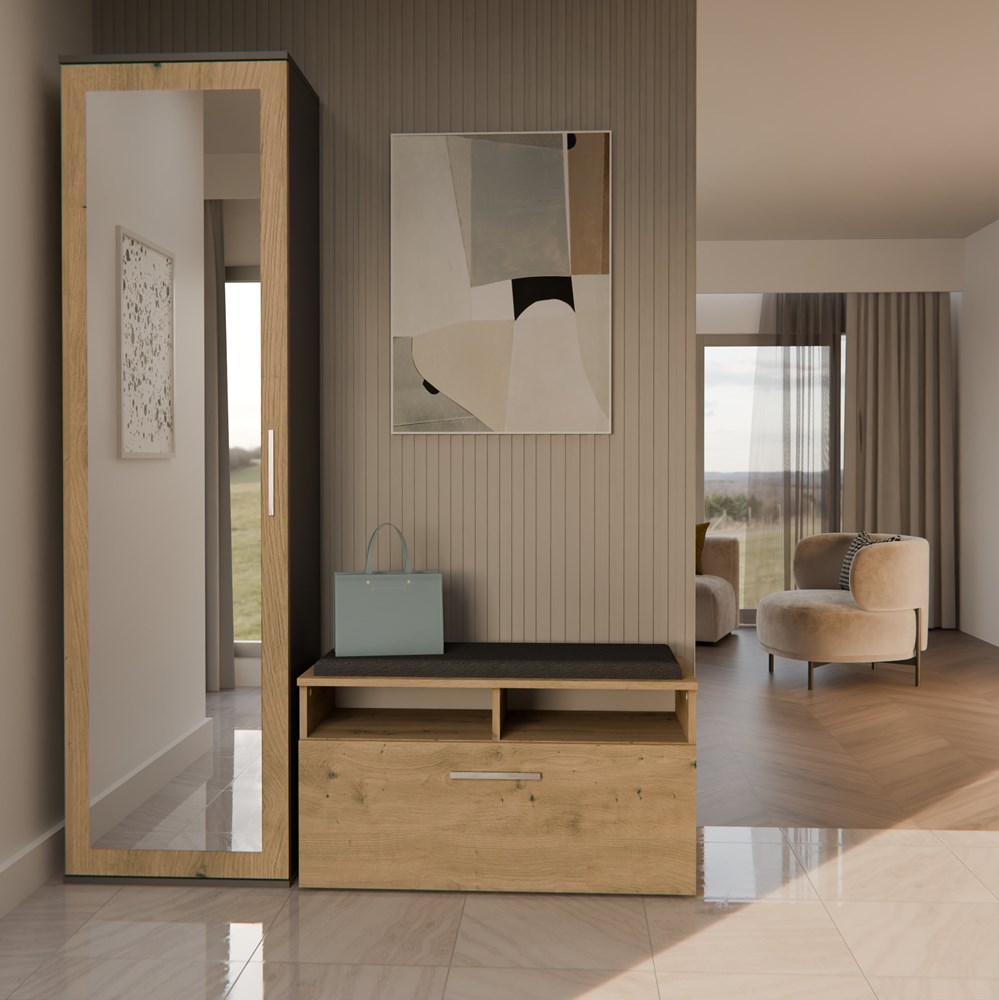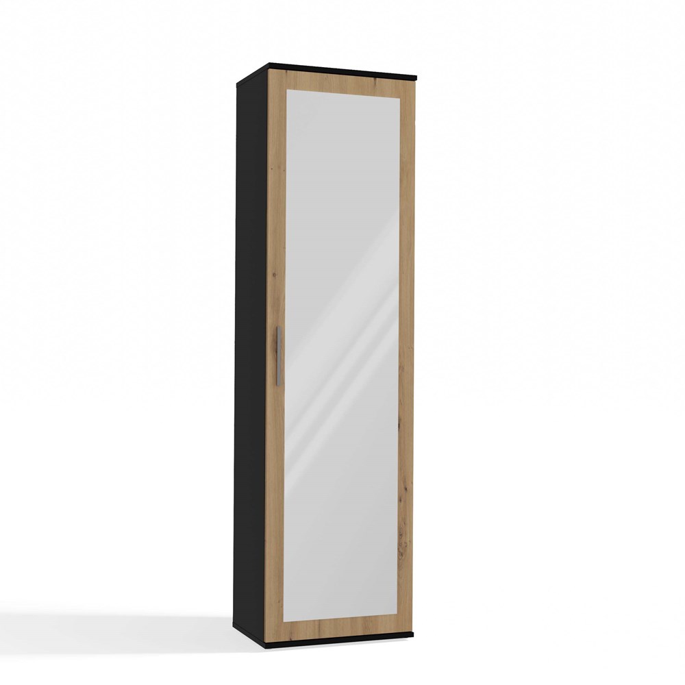 Szafa w kolorze antracyt/dąb artisan z kolekcji Holmes to doskonała propozycja do przedpokój, ale znajdzie swoje miejsce również w innym pomieszczeniu, jak na przykład - czy garderobie, sypialni. Materiał wykonania to płyta laminowana. Szafa posiada półki, drążek na ubrania. Szafa uchylna posiada również lustro, które sprawi, że pomieszczenie stanie się optycznie większe. Mebel będzie świetnym miejscem do wieszania ubrań, na buty lub inne domowe tekstylia. Nowoczesny styl mebli wpadnie do gustu każdemu, kto poszukuje eleganckiego, klasycznego, a zarazem nowoczesnego umeblowania. Idealnie wpasuje się w większość aranżacji. Szafa przeznaczona do samodzielnego montażu.