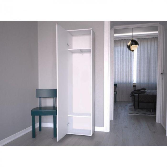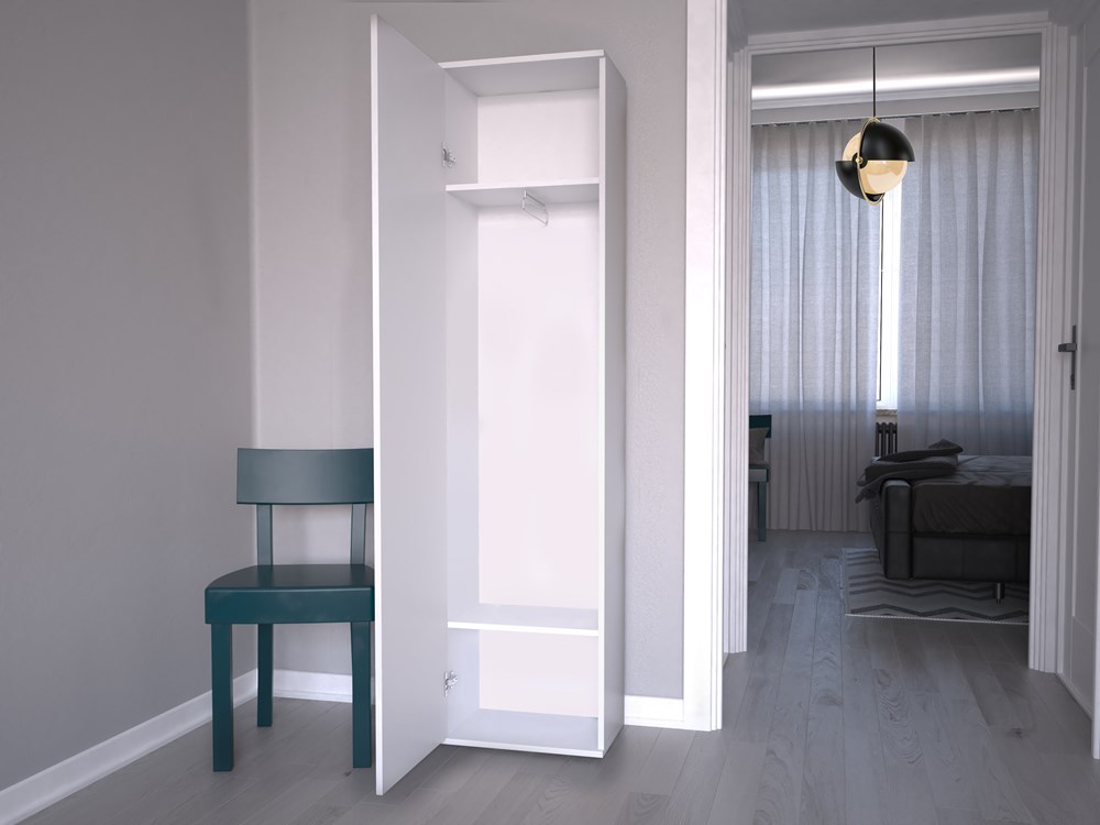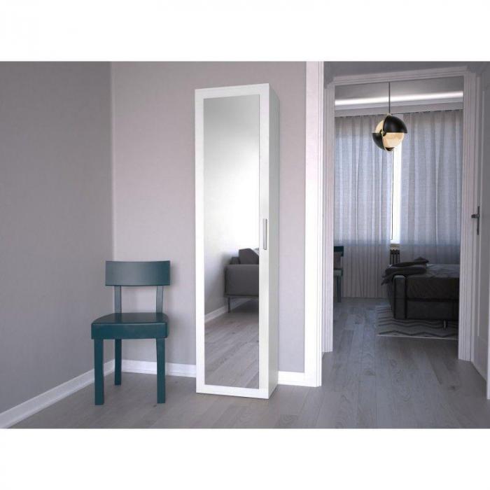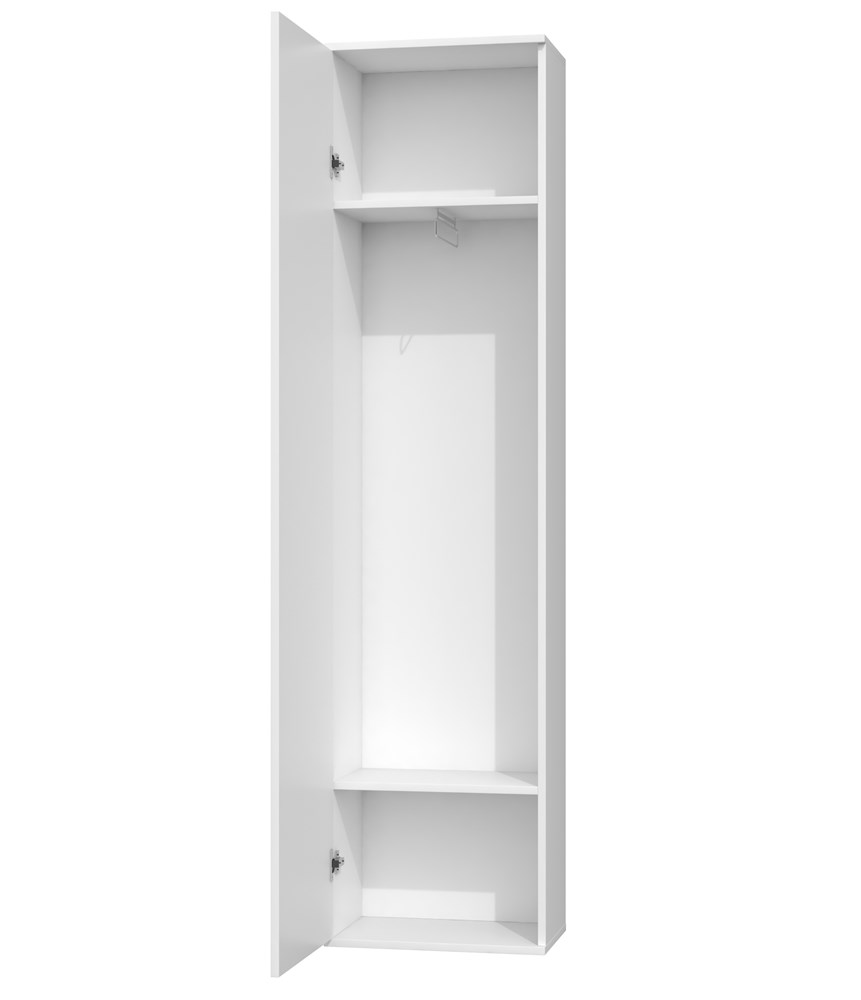 Szafa w kolorze białym z kolekcji Holmes to doskonała propozycja do pokoju dziennego, ale znajdzie swoje miejsce również w innym pomieszczeniu, jak na przykład - przedpokój czy garderobie, sypialni. Materiał wykonania to płyta laminowana. Szafa posiada półki, drążek na ubrania. Szafa uchylna posiada również lustro, które sprawi, że pomieszczenie stanie się optycznie większe. Mebel będzie świetnym miejscem do wieszania ubrań, na buty lub inne domowe tekstylia. Nowoczesny styl mebli wpadnie do gustu każdemu, kto poszukuje eleganckiego, klasycznego, a zarazem nowoczesnego umeblowania. Idealnie wpasuje się w większość aranżacji. Szafa przeznaczona do samodzielnego montażu.