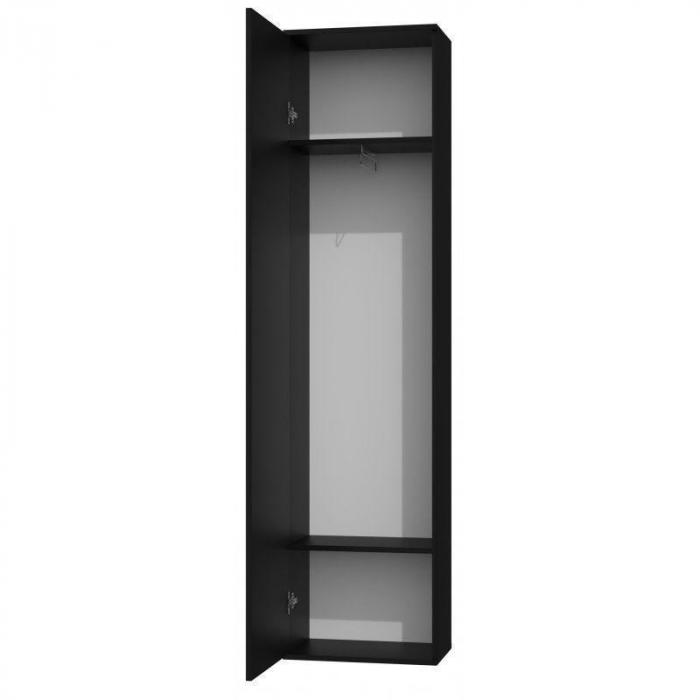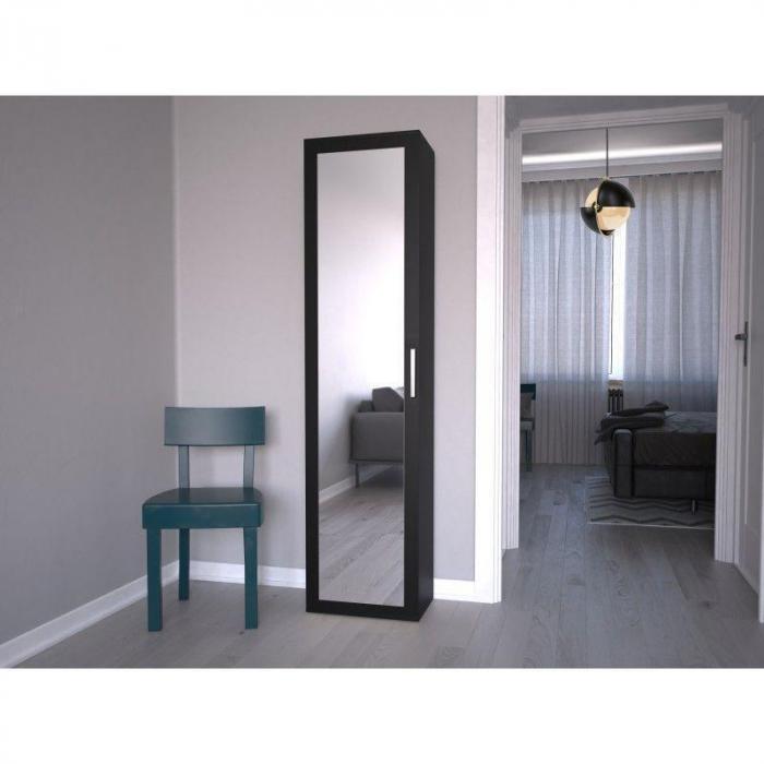 Szafa w kolorze czarnym z kolekcji Holmes to doskonała propozycja do pokoju dziennego, ale znajdzie swoje miejsce również w innym pomieszczeniu, jak na przykład - przedpokój czy garderobie, sypialni. Materiał wykonania to płyta laminowana. Szafa posiada półki, drążek na ubrania. Szafa uchylna posiada również lustro, które sprawi, że pomieszczenie stanie się optycznie większe. Mebel będzie świetnym miejscem do wieszania ubrań, na buty lub inne domowe tekstylia. Nowoczesny styl mebli wpadnie do gustu każdemu, kto poszukuje eleganckiego, klasycznego, a zarazem nowoczesnego umeblowania. Idealnie wpasuje się w większość aranżacji. Szafa przeznaczona do samodzielnego montażu.