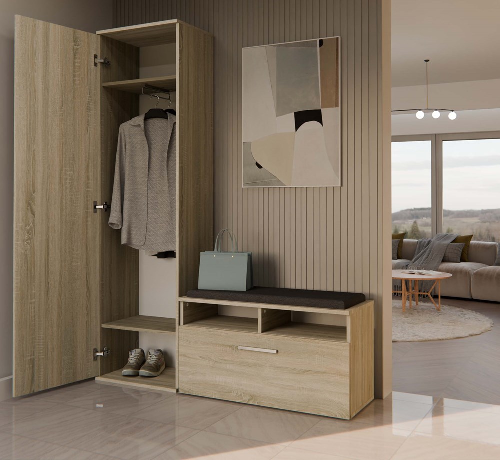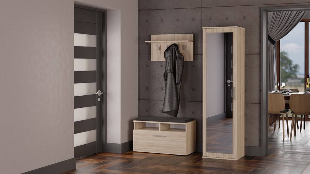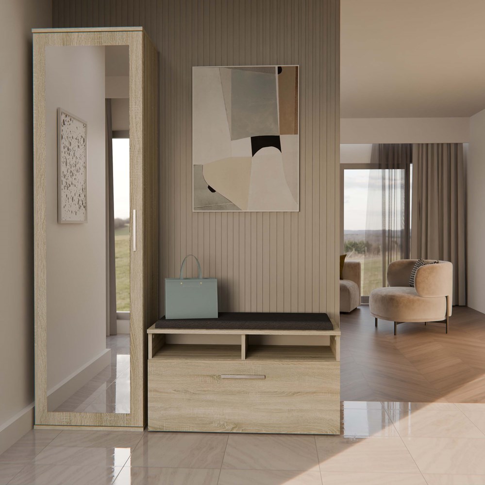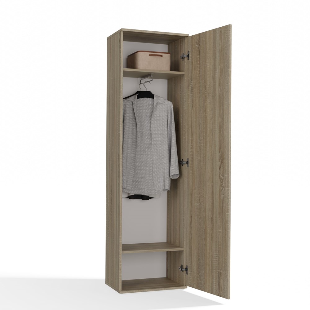Szafa w kolorze dąb sonoma z kolekcji Holmes to doskonała propozycja do pokoju dziennego, ale znajdzie swoje miejsce również w innym pomieszczeniu, jak na przykład - przedpokój czy garderobie, sypialni. Materiał wykonania to płyta laminowana. Szafa posiada półki, drążek na ubrania. Szafa uchylna posiada również lustro, które sprawi, że pomieszczenie stanie się optycznie większe. Mebel będzie świetnym miejscem do wieszania ubrań, na buty lub inne domowe tekstylia. Nowoczesny styl mebli wpadnie do gustu każdemu, kto poszukuje eleganckiego, klasycznego, a zarazem nowoczesnego umeblowania. Idealnie wpasuje się w większość aranżacji. Szafa przeznaczona do samodzielnego montażu.