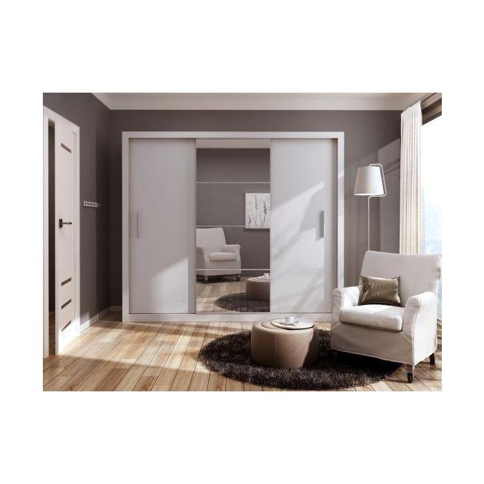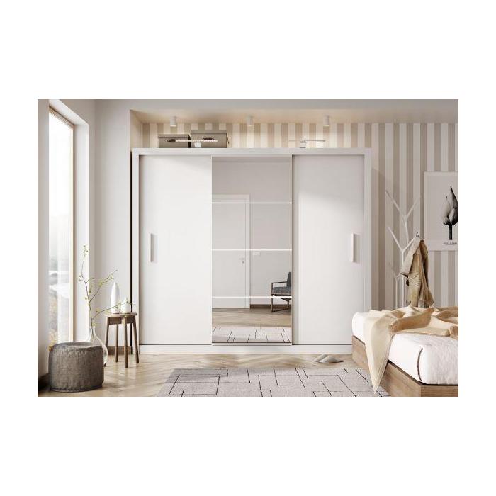 Pojemna, obszerna szafa z trojgiem drzwi przesuwnych i lustrami optycznie powiększającymi wnętrze. Lustra wykonane ze szkła hartowanego o grubości 4 mm. Wyposażona wyposażona w 6 półek oraz dwa drążki na ubrania. Mebel wykonano z wytrzymałej płyty laminowanej wykończonej trwałym obrzeżem ABS. Szafa przeznaczona do samodzielnego montażu.