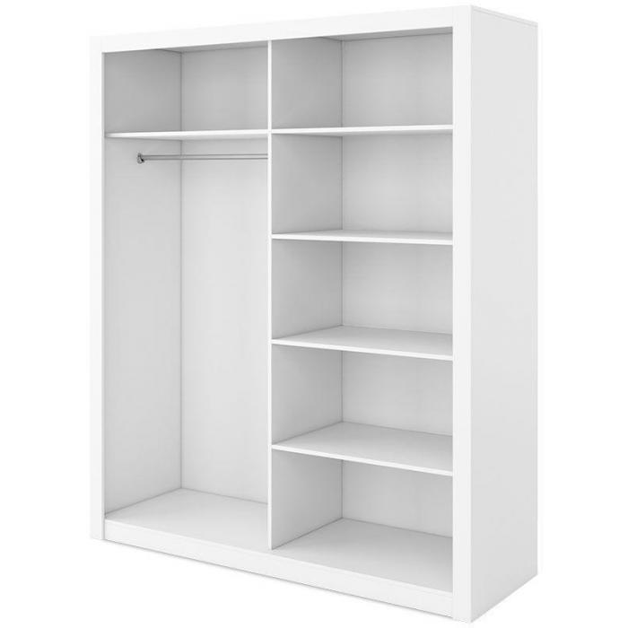 Pojemna, obszerna szafa z dwojgiem drzwi przesuwnych i lustrami optycznie powiększającymi wnętrze. Lustro wykonane ze szkła hartowanego o grubości 4 mm. Wyposażona w drążek na wieszaki oraz półki (dopuszczalne obciążenie półki 5 kg). Mebel wykonano z wytrzymałej płyty laminowanej wykończonej trwałym obrzeżem ABS. Uchwyty wykonane z tworzywa, prowadnice aluminiowe, montaż dolny i górny. Do skompletowania z kontenerkiem ID-13. Szafa przeznaczona do samodzielnego montażu.