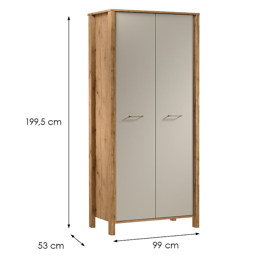 Szafa Indygo S2D to idealne połączenie funkcjonalności i nowoczesnego stylu, które wprowadza elegancję do każdej przestrzeni. O wymiarach 99 cm szerokości, 199,5 cm wysokości oraz 53 cm głębokości, szafa oferuje mnóstwo miejsca na przechowywanie odzieży oraz innych przedmiotów. Klasyczne dwudrzwiowe fronty wykonane z płyty wiórowej laminowanej w połączeniu z matowym wykończeniem nadają jej nowoczesny wygląd, który harmonijnie wpisuje się w różnorodne aranżacje wnętrz. Kolor beżowy frontów oraz dąb wotan korpusu sprawiają, że mebel jest nie tylko praktyczny, ale również estetyczny, wnosząc do wnętrza ciepło i przytulność.