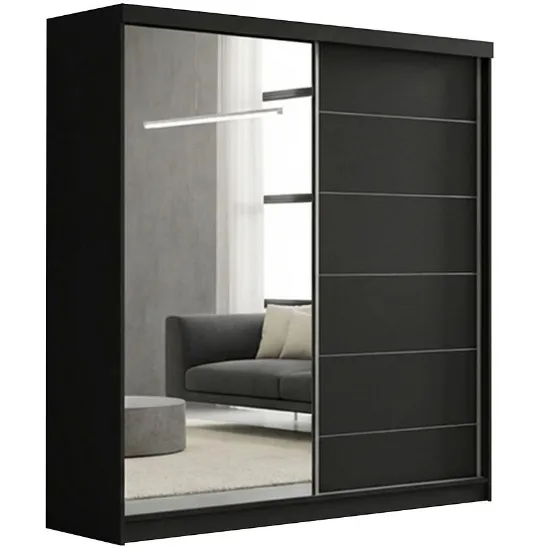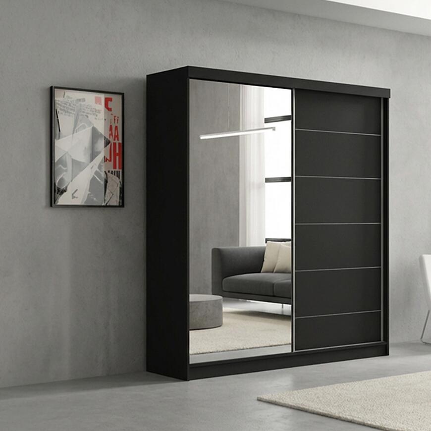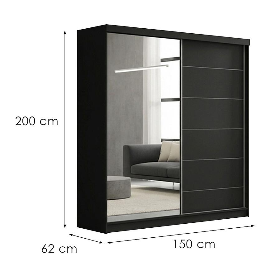 Szafa Infiniti 150 w kolorze czarnym to propozycja dla osób poszukujących eleganckiego i praktycznego mebla do przechowywania w nowoczesnych aranżacjach. Model o szerokości 150 cm, wysokości 200 cm oraz głębokości 62 cm świetnie sprawdza się w sypialni, garderobie oraz przedpokoju. Dzięki zastosowaniu drzwi przesuwnych szafa nie wymaga dodatkowej przestrzeni do otwierania, co pozwala na wygodne użytkowanie nawet w mniejszych pomieszczeniach. Szafa przesuwna 150 cm z lustrem optycznie powiększa wnętrze, jednocześnie zapewniając komfort codziennego użytkowania.