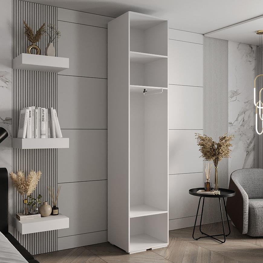 Szafa uchylna w kolorze białym z kolekcji Ivo to doskonała propozycja do pokoju dziennego, ale znajdzie swoje miejsce również w innym pomieszczeniu, jak na przykład - przedpokój czy garderobie, sypialni. Materiał wykonania to płyta wiórowa laminowana. Zarówno fronty, jak i korpus szafy są wykończone matową powierzchnią, co nadaje meblowi wyjątkową fakturę. Szafa Ivo prezentuje się w nowoczesnym stylu, który idealnie wpisuje się w trendy wystroju wnętrz, dzięki czemu szafa świetnie sprawdzi się w różnych aranżacjach. Szafa przeznaczona do samodzielnego montażu.