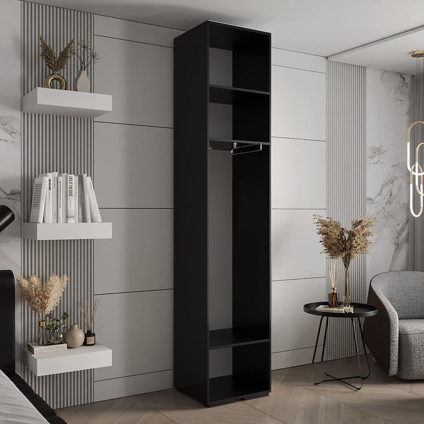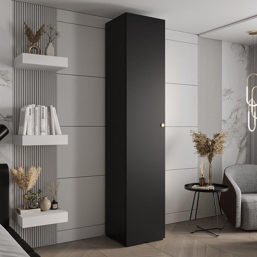 Szafa uchylna w kolorze czarnym z kolekcji Ivo to doskonała propozycja do pokoju dziennego, ale znajdzie swoje miejsce również w innym pomieszczeniu, jak na przykład - przedpokój czy garderobie, sypialni. Materiał wykonania to płyta wiórowa laminowana. Zarówno fronty, jak i korpus szafy są wykończone matową powierzchnią, co nadaje meblowi wyjątkową fakturę. Szafa Ivo prezentuje się w nowoczesnym stylu, który idealnie wpisuje się w trendy wystroju wnętrz, dzięki czemu szafa świetnie sprawdzi się w różnych aranżacjach. Szafa przeznaczona do samodzielnego montażu.