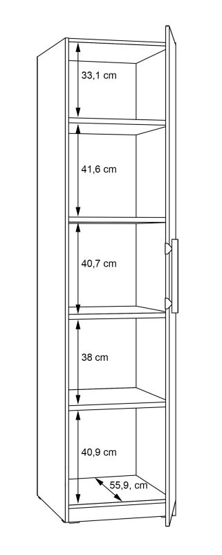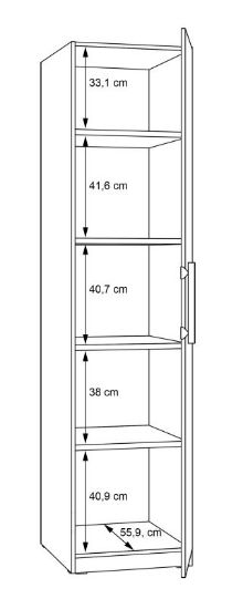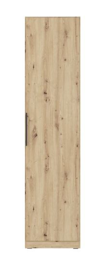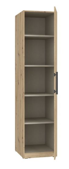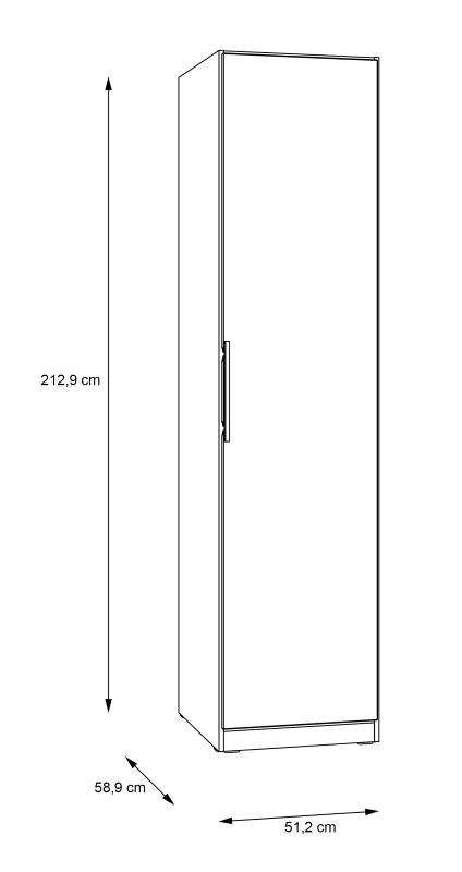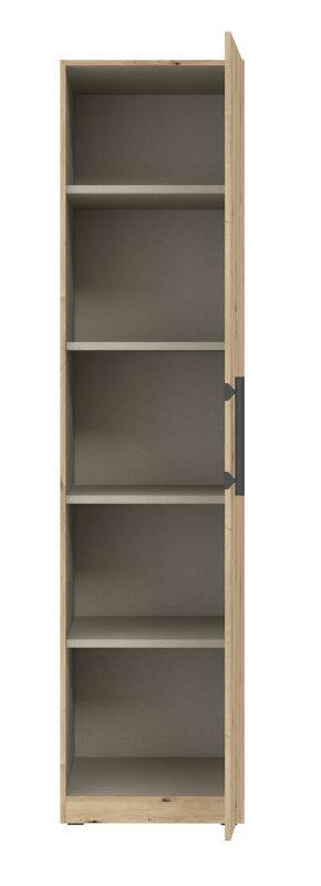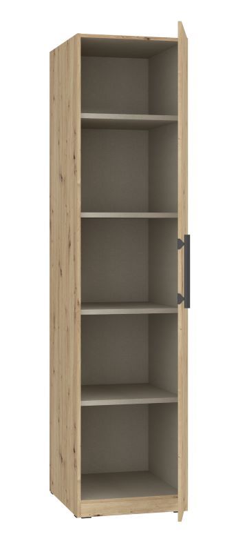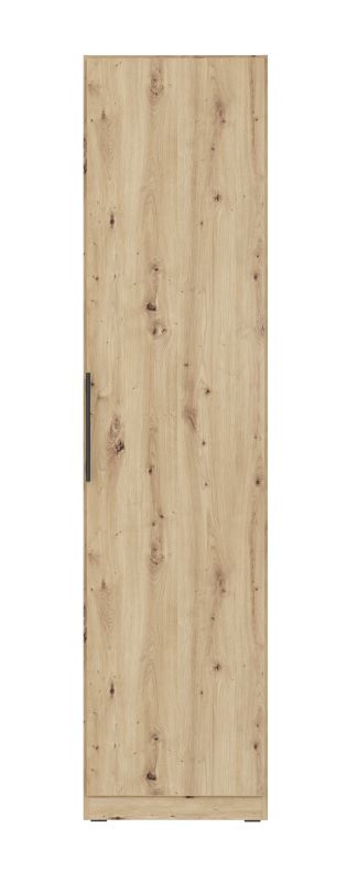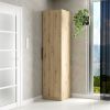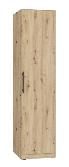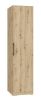 Wąska szafa ubraniowa Kadi 2 CDXS81 to praktyczne uzupełnienie aranżacji sypialni, garderoby lub przedpokoju. Za uchylanymi drzwiami znajdują się cztery półki, do przechowywania ubrań, pościeli lub innych rzeczy osobistych. Dwie półki mają możliwość regulowania wysokości. Korpusy i fronty dostępne w wybarwieniu dąb artisan. Uchwyty z tworzywa w kolorze czarnym. W meblu zastosowano nóżki typu ślizgacz. Szafa w zestawie posiada komplet okuć do montażu ściennego.
