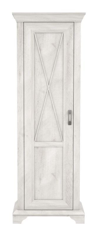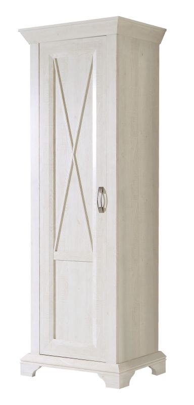Szafa jednodrzwiowa Kashmir KSMS71-D43 dostępna jest w dekorze Pinia Biała. Wewnątrz znajduje się jedna półka oraz drążek na ubrania. Bogate zdobienia, ramkowe fronty, krzyżowe szprosy oraz metalowy uchwyt w kolorze imitującym stare srebro nadają jej niepowtarzalnego charakteru. Szafę należy zamontować do ściany (potrzebne okucia dołączone są do mebla).