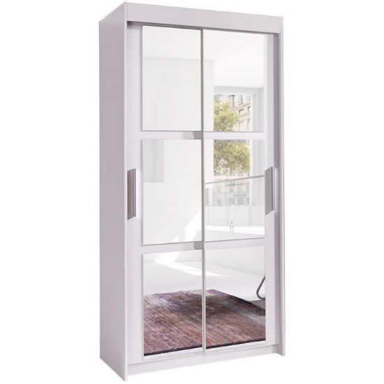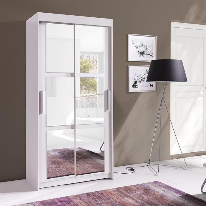 Szafa przesuwna w kolorze białym propozycja do pokoju dziennego, ale znajdzie swoje miejsce również w innym pomieszczeniu, jak na przykład - przedpokój czy garderobie. Materiał wykonania to płyta wiórowa laminowana. Szafa posiada również lustro, które sprawi, że pomieszczenie stanie się optycznie większe. Nowoczesny styl mebli wpadnie do gustu każdemu, kto poszukuje eleganckiego, klasycznego, a zarazem nowoczesnego umeblowania. Idealnie wpasuje się w większość aranżacji. Przeznaczona do samodzielnego montażu.
