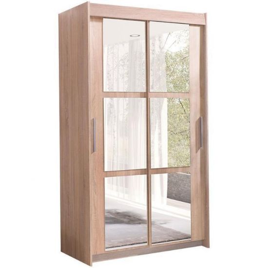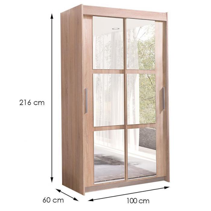 Szafa przesuwna w kolorze sonoma propozycja do pokoju dziennego, ale znajdzie swoje miejsce również w innym pomieszczeniu, jak na przykład - przedpokój czy garderobie. Materiał wykonania to płyta wiórowa laminowana. Szafa posiada również lustro, które sprawi, że pomieszczenie stanie się optycznie większe. Nowoczesny styl mebli wpadnie do gustu każdemu, kto poszukuje eleganckiego, klasycznego, a zarazem nowoczesnego umeblowania. Idealnie wpasuje się w większość aranżacji. Przeznaczona do samodzielnego montażu.