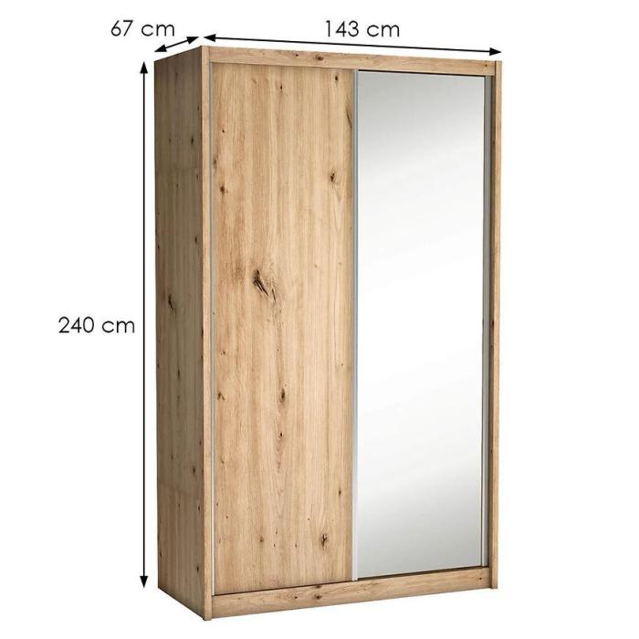 Szafa w kolorze dąb artisan z serii Karol to doskonała propozycja do pokoju dziennego, ale znajdzie swoje miejsce również w innym pomieszczeniu, jak na przykład - przedpokój czy garderobie, sypialni. Materiał wykonania to płyta laminowana. Szafa posiada półki, drążek na ubrania oraz szuflady, a także lustro, które sprawi, że pomieszczenie stanie się optycznie większe. Mebel będzie świetnym miejscem do wieszania ubrań, na buty lub inne domowe tekstylia. Styl mebli wpadnie do gustu każdemu, kto poszukuje eleganckiego, klasycznego, a zarazem nowoczesnego umeblowania. Idealnie wpasuje się w większość aranżacji. Szafa przeznaczona do samodzielnego montażu.