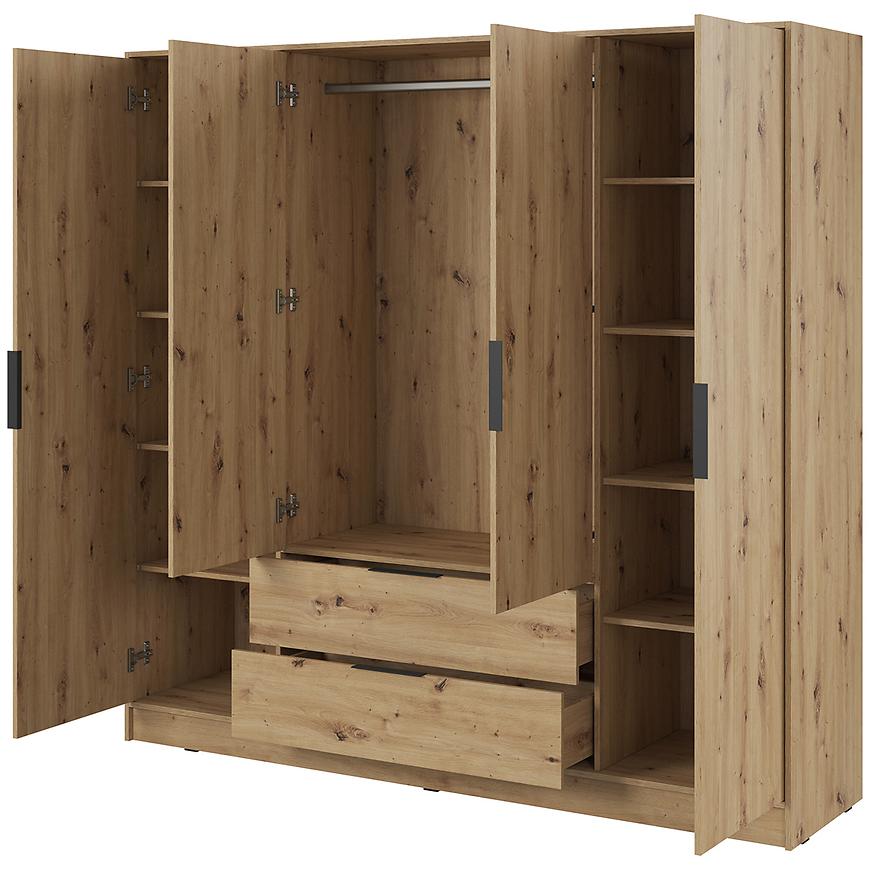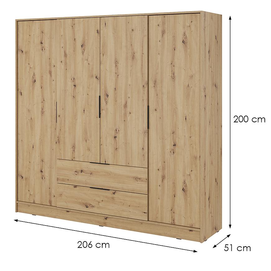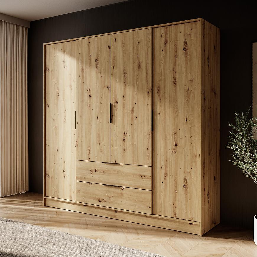 Szafa Kelly 4D bez lustra w wybarwieniu artisan to połączenie elegancji, przestronności i nowoczesnego designu. Dzięki imponującej szerokości 206 cm, wysokości 200 cm i głębokości 51 cm oferuje ogromną ilość miejsca do przechowywania odzieży, pościeli czy innych domowych tekstyliów. Klasyczne, czterodrzwiowe otwieranie zapewnia wygodny dostęp do wnętrza, a staranne matowe wykończenie w kolorze jasnego drewna artisan wprowadza do wnętrza przytulność i naturalne ciepło. Zarówno fronty, jak i korpus wykonano z trwałej płyty wiórowej laminowanej, gwarantującej solidność i wieloletnie użytkowanie. Szafa z kolekcji KELLY doskonale sprawdzi się w sypialni. Waga 156 kg świadczy o solidnej konstrukcji. Mebel dostarczany jest w paczkach do samodzielnego montażu. Postaw na funkcjonalność i estetykę – wybierz szafę Kelly i zadbaj o porządek w wielkim stylu!