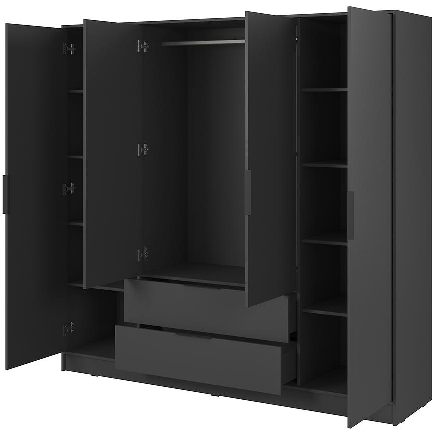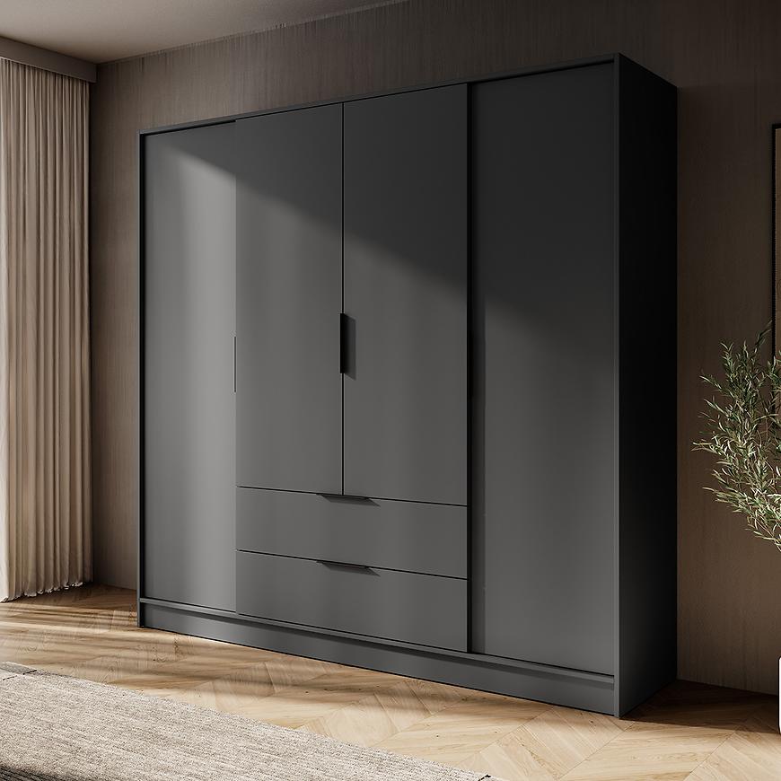 Szafa Kelly 4D bez lustra w eleganckim kolorze grafitowym to idealne rozwiązanie do nowoczesnej sypialni. Jej duży rozmiar – 206 cm szerokości, 200 cm wysokości i 51 cm głębokości – zapewnia ogromną przestrzeń do przechowywania ubrań, pościeli i dodatków. Cztery klasyczne drzwi gwarantują wygodny dostęp do wnętrza, a matowe wykończenie frontów i korpusu podkreśla minimalistyczny styl mebla. Wykonana z solidnej płyty wiórowej laminowanej szafa wyróżnia się trwałością i stabilnością – jej waga to aż 156 kg. Głęboki grafit wprowadza do sypialni wyrafinowany, nieco industrialny klimat, który świetnie komponuje się zarówno z jasnymi, jak i ciemnymi dodatkami. Szafa pochodzi z kolekcji KELLY i dostarczana jest do samodzielnego montażu. Jeżeli szukasz stylowej, pojemnej i trwałej szafy do sypialni – model Kelly 4D w kolorze grafit to doskonały wybór.