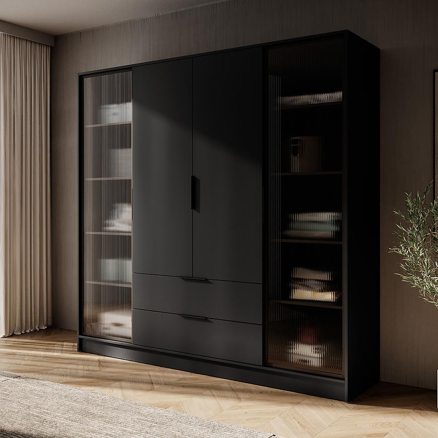 Szafa Kelly 4D RD bez lustra w eleganckim, matowym kolorze czarnym to nowoczesna propozycja do sypialni, w której liczy się styl i funkcjonalność. Dzięki szerokości 206 cm, wysokości 200 cm i głębokości 51 cm, zapewnia przestronne wnętrze do przechowywania ubrań, dodatków i innych akcesoriów. Cztery klasyczne drzwi ułatwiają dostęp do zawartości, a nowoczesne oświetlenie LED dodaje szafie wyrazistego charakteru i podkreśla jej designerski wygląd. Konstrukcja z trwałej płyty wiórowej laminowanej w matowym wykończeniu gwarantuje trwałość i estetykę na lata. Mebel z kolekcji KELLY doskonale wpisuje się w wystrój nowoczesnej sypialni, oferując połączenie elegancji z codzienną wygodą użytkowania. Waga 164 kg, produkt przeznaczony do samodzielnego montażu.