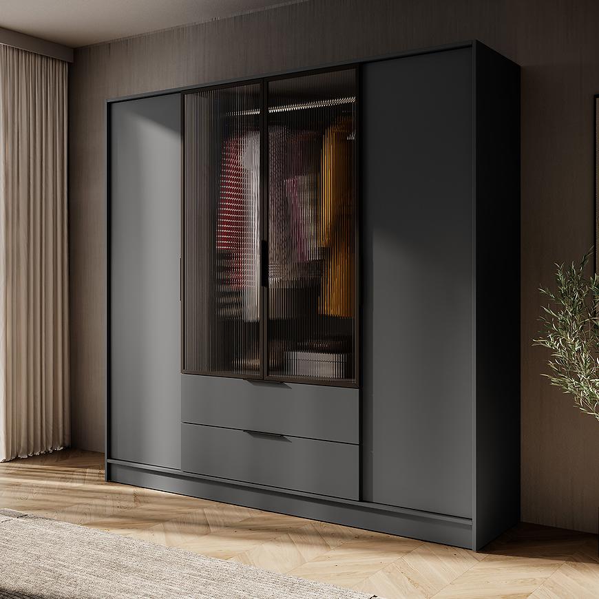Szafa Kelly 4D RM bez lustra w kolorze grafitowym z oświetleniem LED to elegancka i funkcjonalna propozycja do nowoczesnej sypialni. Dzięki dużym wymiarom – 206 cm szerokości, 200 cm wysokości i 51 cm głębokości – zapewnia mnóstwo miejsca na przechowywanie ubrań, pościeli oraz innych sypialnianych akcesoriów. Klasyczne, czterodrzwiowe otwieranie gwarantuje wygodę użytkowania, a stonowany grafit w matowym wykończeniu nadaje wnętrzu wyrazisty, nowoczesny charakter. Korpus i fronty wykonano z trwałej płyty wiórowej laminowanej, co zapewnia solidność i długowieczność – całość waży 165 kg. Zintegrowane oświetlenie LED podkreśla estetykę mebla i podnosi komfort wieczornego użytkowania. Szafa z kolekcji KELLY doskonale sprawdzi się jako główny element przechowywania w każdej sypialni urządzonej w nowoczesnym stylu. Mebel przeznaczony do samodzielnego montażu – gotowy, by uporządkować Twoją przestrzeń w stylowy sposób.