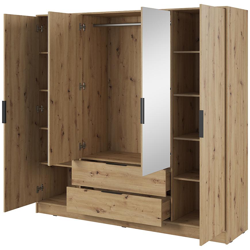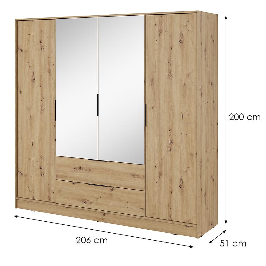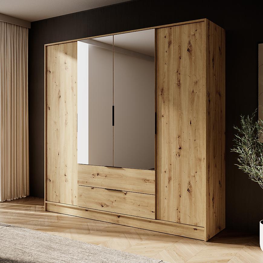 Szafa Kelly 4D z lustrem w naturalnym wybarwieniu artisan to stylowe i funkcjonalne wyposażenie każdej nowoczesnej sypialni. Duża pojemność (206 cm szerokości, 200 cm wysokości, 51 cm głębokości) sprawia, że bez trudu pomieści wszystkie niezbędne ubrania, pościel czy dodatki. Cztery klasyczne drzwi oraz centralnie umieszczone lustro to nie tylko wygoda użytkowania, ale również praktyczne rozwiązanie, które optycznie powiększa przestrzeń w sypialni i dodaje jej lekkości. Matowe wykończenie frontów i korpusu w odcieniu jasnego drewna artisan wprowadza ciepły, przytulny klimat, który sprzyja wypoczynkowi. Szafa wykonana jest z trwałej płyty wiórowej laminowanej, waży 166 kg i dostarczana jest do samodzielnego montażu. Model z kolekcji KELLY to idealny wybór do sypialni – łączy nowoczesny design z dużą funkcjonalnością i eleganckim wykończeniem.