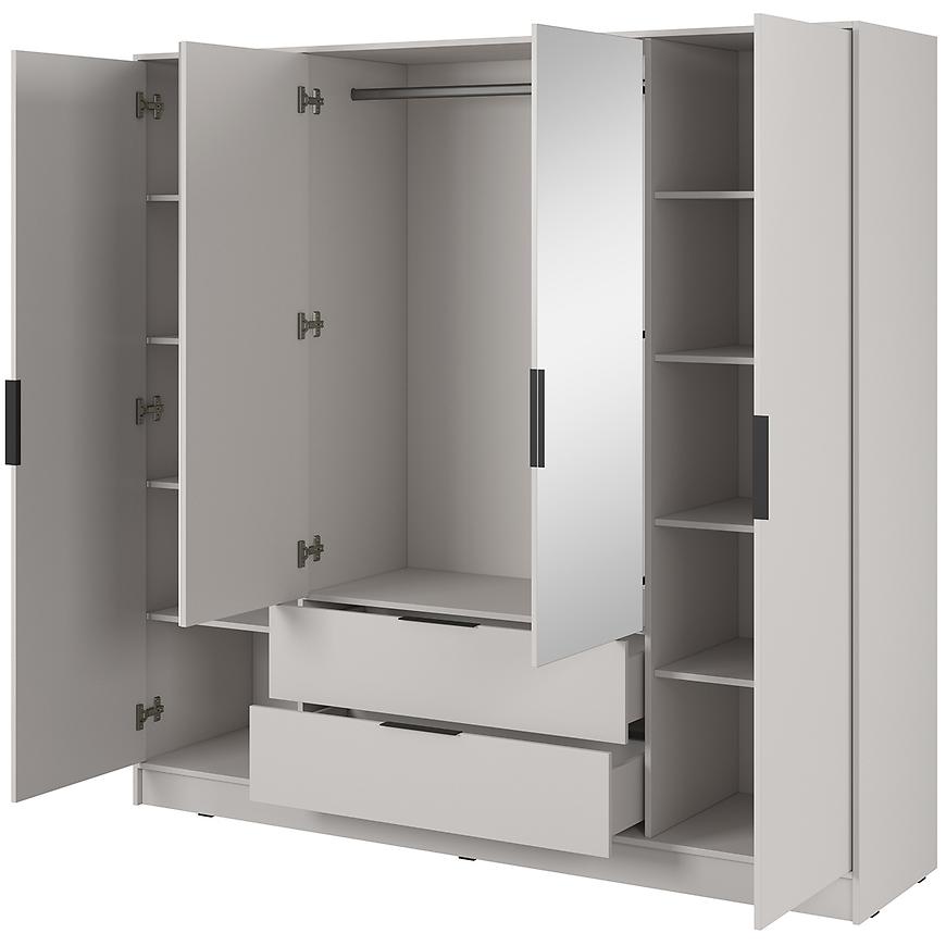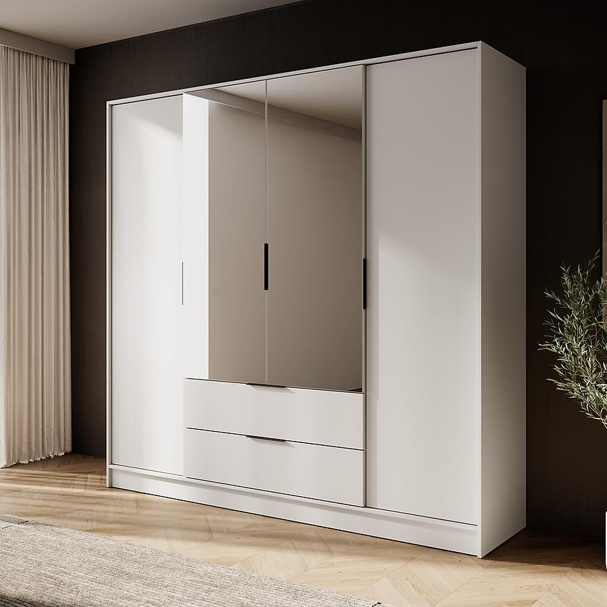 Szafa Kelly 4D z lustrem w subtelnym odcieniu cashmere to idealny wybór do nowoczesnej sypialni, w której liczy się zarówno styl, jak i funkcjonalność. Dzięki dużym wymiarom (206 cm szerokości, 200 cm wysokości i 51 cm głębokości) oferuje mnóstwo miejsca na odzież, pościel i inne niezbędne przedmioty. Cztery klasyczne drzwi gwarantują wygodny dostęp, a lustro umieszczone na froncie nie tylko ułatwia codzienne przygotowania, ale również optycznie powiększa przestrzeń w sypialni. Całość wykonana jest z trwałej płyty wiórowej laminowanej, wykończonej matowo, co nadaje meblowi nowoczesny, elegancki charakter. Beżowy kolor cashmere wprowadza do wnętrza ciepło i delikatność, tworząc przytulną atmosferę sprzyjającą relaksowi. Szafa z kolekcji KELLY waży 166 kg i przeznaczona jest do samodzielnego montażu. Postaw na praktyczność i estetykę – wybierz szafę Kelly z lustrem do swojej sypialni.
