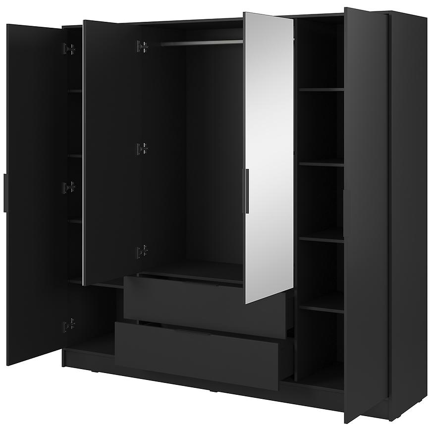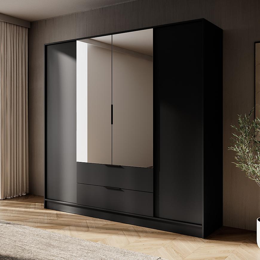 Szafa Kelly 4D z lustrem w kolorze czarnym to doskonały wybór do nowoczesnej sypialni, w której liczy się elegancja, przestrzeń i praktyczność. Jej imponujące wymiary – 206 cm szerokości, 200 cm wysokości i 51 cm głębokości – oferują dużą powierzchnię do przechowywania ubrań, pościeli i innych akcesoriów. Cztery klasyczne drzwi ułatwiają dostęp do wnętrza, a centralne lustro nie tylko pełni funkcję użytkową, ale także optycznie powiększa przestrzeń sypialni. Szafa wykonana została z trwałej płyty wiórowej laminowanej, wykończonej w eleganckim, matowym czarnym kolorze. Jej nowoczesny wygląd wprowadza do wnętrza wyrazisty, loftowy klimat, który doskonale komponuje się z jasnymi ścianami lub drewnianymi dodatkami. Szafa z kolekcji KELLY waży 166 kg i dostarczana jest w paczkach do samodzielnego montażu. To stylowe i funkcjonalne rozwiązanie dla każdej sypialni, która ma wyróżniać się charakterem i uporządkowaną przestrzenią.
