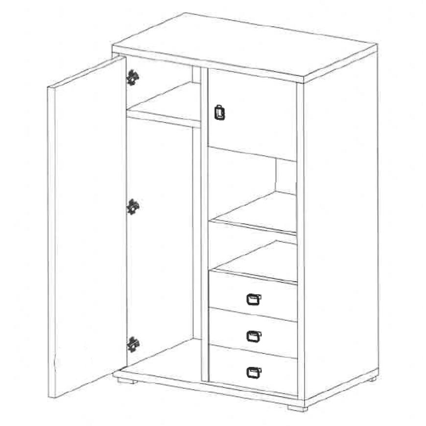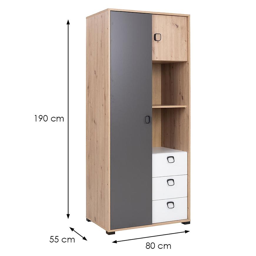 Szafa uchylna w kolorze grafit/ biały/ dąb artisan z kolekcji Kevin to doskonała propozycja do pokoju młodzieżowego, ale znajdzie swoje miejsce również w innym pomieszczeniu, jak na przykład - przedpokój czy garderobie, sypialni. Materiał wykonania to płyta wiórowa laminowana. Posiada wybarwienie szare. Duża szafa posiada również szuflady, które sprawią, że mamy jeszcze więcej miejsca na przechowywanie. Wygląd szafy sprawi, że wpasuje się w większość aranżacji. Szafa będzie świetnym miejscem do wieszania ubrań, na buty lub inne domowe tekstylia. Nowoczesny styl mebli wpadnie do gustu każdemu, kto poszukuje eleganckiego, klasycznego, a zarazem nowoczesnego umeblowania. Szafa świetnie sprawdzi się w różnych aranżacjach, szczególnie w stylu nowoczesnym. Szafa przeznaczona do samodzielnego montażu.