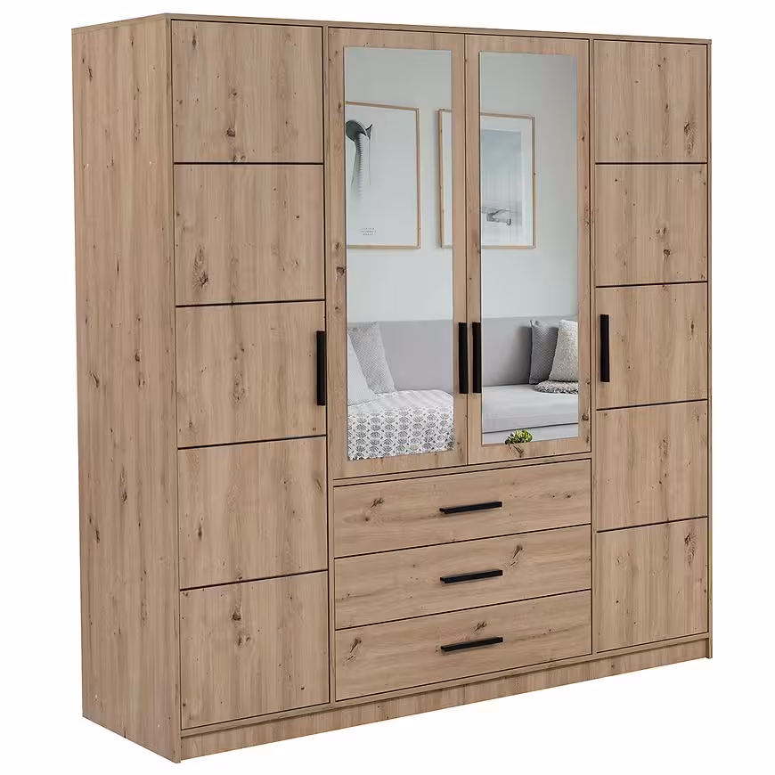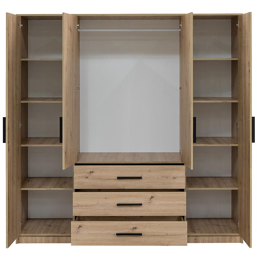 Dąb artisan to kolor, który nadaje szafie Kos niezwykłego charakteru. Matowe wykończenie podkreśla naturalny urok drewna, jednocześnie chroniąc mebel przed codziennym zużyciem. Konstrukcja oparta na solidnej płycie wiórowej laminowanej zapewnia trwałość i stabilność.