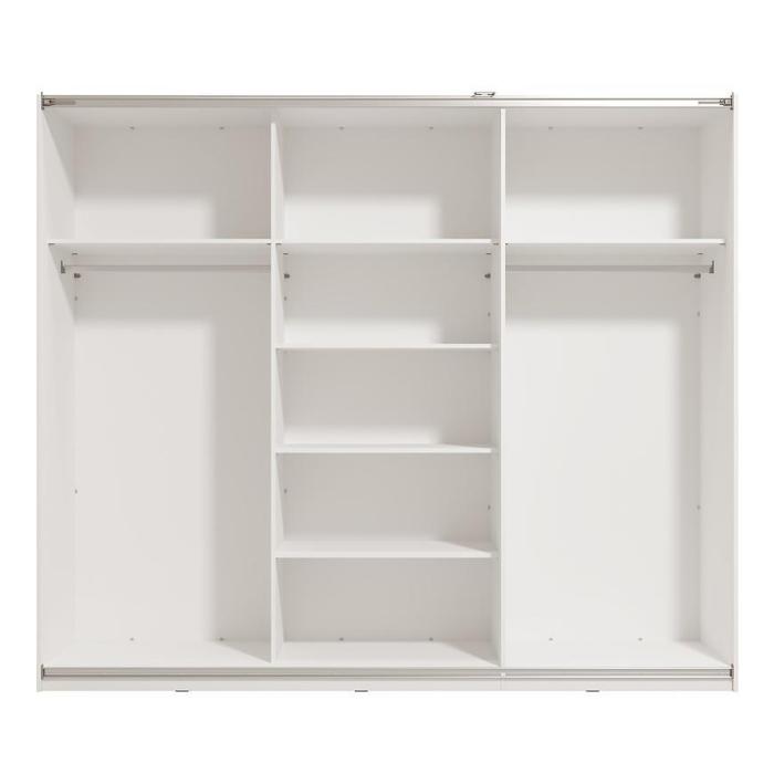 Jej wnętrze podzielone jest na trzy części, w której znajduje się miejsce na drążek na długie ubrania oraz półki do przechowywania ubrań i rzeczy. Pojemna szafa jest wykonana z odpornej płyty laminowanej.