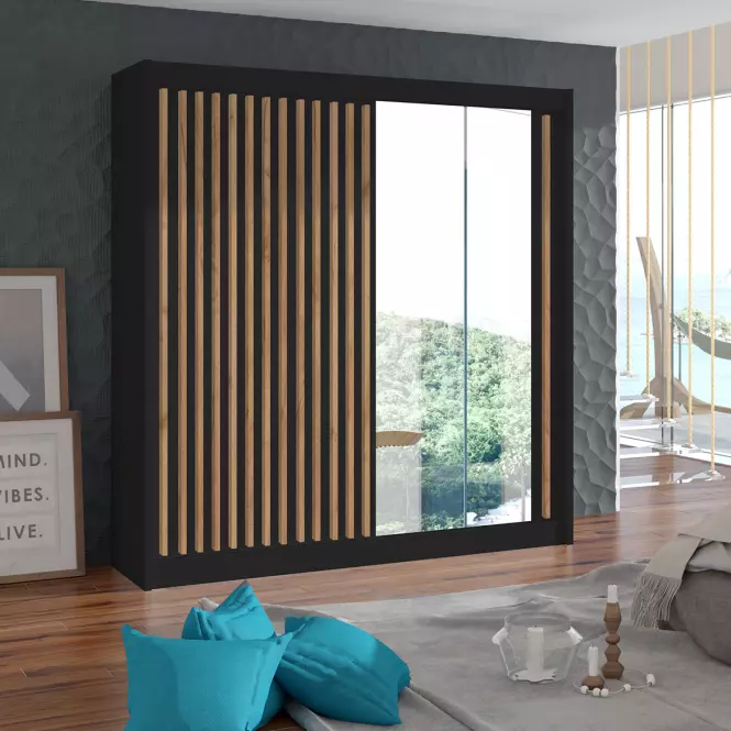 Szafa Ladder to doskonały wybór dla osób, które szukają mebla łączącego nowoczesny styl z funkcjonalnością. Jej czarna kolorystyka z elementami dębu craft, przesuwnymi drzwiami i dużym lustrem sprawia, że jest to mebel, który wprowadzi do wnętrza elegancję, a jednocześnie pozwoli na efektywne zarządzanie przestrzenią. Idealnie wpasuje się w nowoczesne mieszkania, w których liczy się zarówno estetyka, jak i praktyczne rozwiązania.