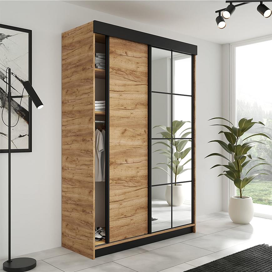 Szafa Lamaro wyróżnia się charakterystycznym designem - to prosta, dwudrzwiowa konstrukcja z drzwiami przesuwnymi oraz ozdobnym detalem na froncie w kształcie ramy okiennej. Przesuwne drzwi ułatwiają dostęp do wnętrza szafy, co może okazać się szczególnie istotne w przypadku małych pomieszczeń. Kolor dąb złoty craft pozwoli ocieplić pomieszczenie, jednocześnie dodając mu charakteru. Dodatkowo, matowe wykończenie frontów i korpusu dodaje elegancji, podkreślając jego wysoką jakość. Szafa Lamaro posiada praktyczne lustrzane drzwi, co sprawia, że stanowi nie tylko miejsce do przechowywania, ale także funkcjonalny element dekoracyjny. Czarne wstawki nadają meblowi wyjątkowego charakteru, tworząc efektowne detale.