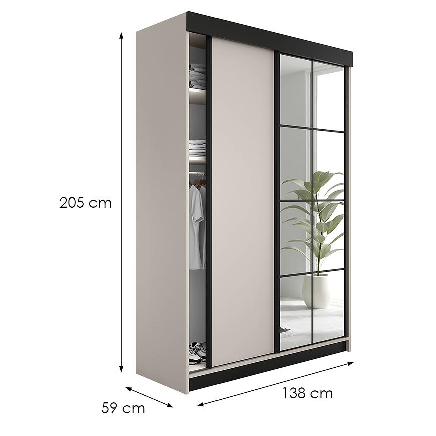 Jej nowoczesny design łączy eleganckie beżowe wybarwienie kaszmiru z modnymi czarnymi akcentami, które dodają wnętrzu charakteru i wyrafinowania. Szafa ma szerokość 138 cm, wysokość 205 cm i głębokość 59 cm, co zapewnia optymalną przestrzeń do przechowywania ubrań, dodatków czy codziennych akcesoriów, a przy tym nie zajmuje zbyt dużo miejsca.