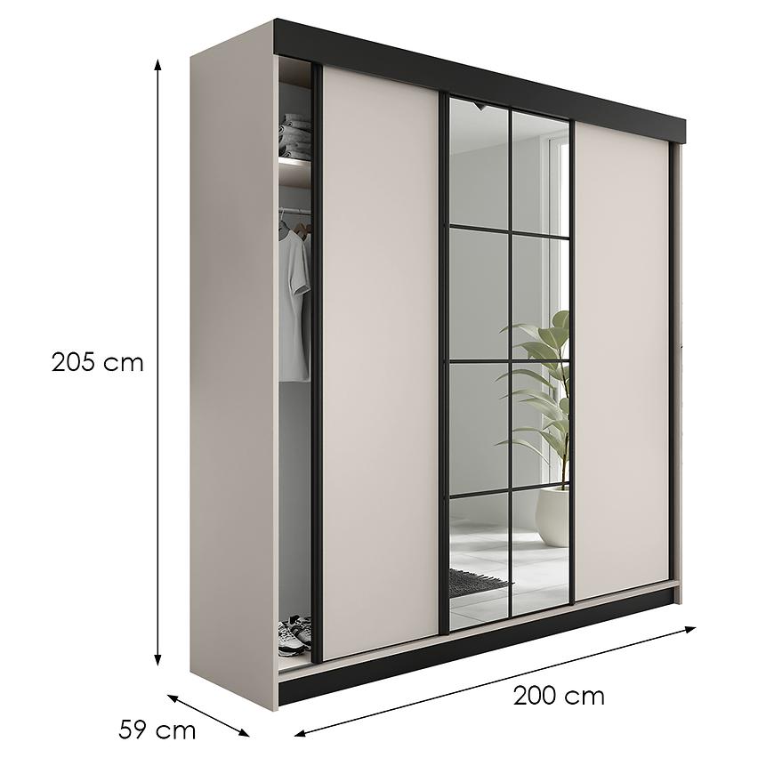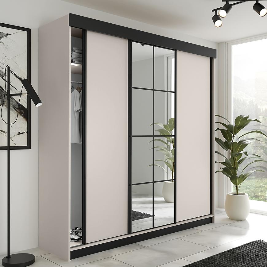Szafa Lamaro 200 Kaszmir + Czarne Wstawki to pojemny i elegancki mebel, który doskonale sprawdzi się w sypialni, pokoju młodzieżowym oraz przedpokoju. Jej nowoczesna forma i starannie dobrana kolorystyka – ciepły odcień kaszmiru zestawiony z czarnymi akcentami – dodają wnętrzu wyrafinowanego charakteru i tworzą spójną, estetyczną całość.
