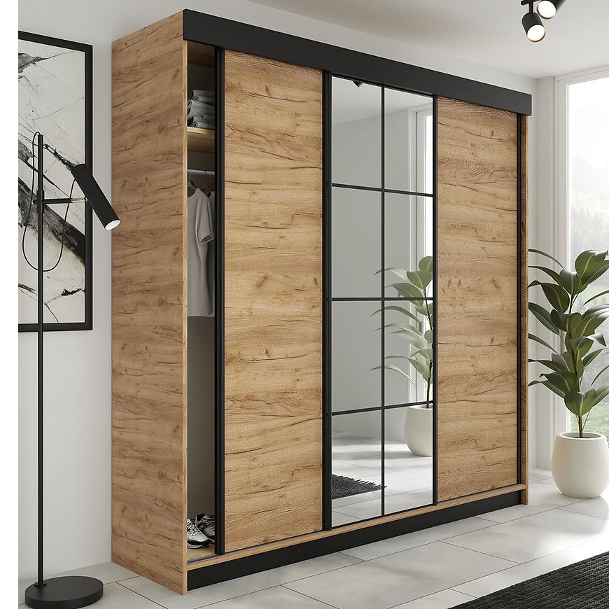 Szafa Lamaro wyróżnia się charakterystycznym designem - to prosta, dwudrzwiowa konstrukcja z drzwiami przesuwnymi oraz ozdobnym detalem na froncie w kształcie ramy okiennej. Przesuwne drzwi ułatwiają dostęp do wnętrza szafy, co może okazać się szczególnie istotne w przypadku małych pomieszczeń. Kolor dąb złoty craft pozwoli ocieplić pomieszczenie, jednocześnie dodając mu charakteru. Dodatkowo, matowe wykończenie frontów i korpusu dodaje elegancji, podkreślając jego wysoką jakość. Szafa Lamaro posiada praktyczne lustrzane drzwi, co sprawia, że stanowi nie tylko miejsce do przechowywania, ale także funkcjonalny element dekoracyjny. Czarne wstawki nadają meblowi wyjątkowego charakteru, tworząc efektowne detale.