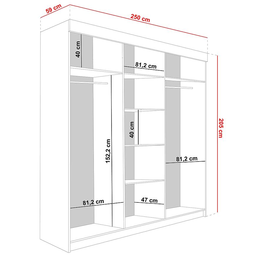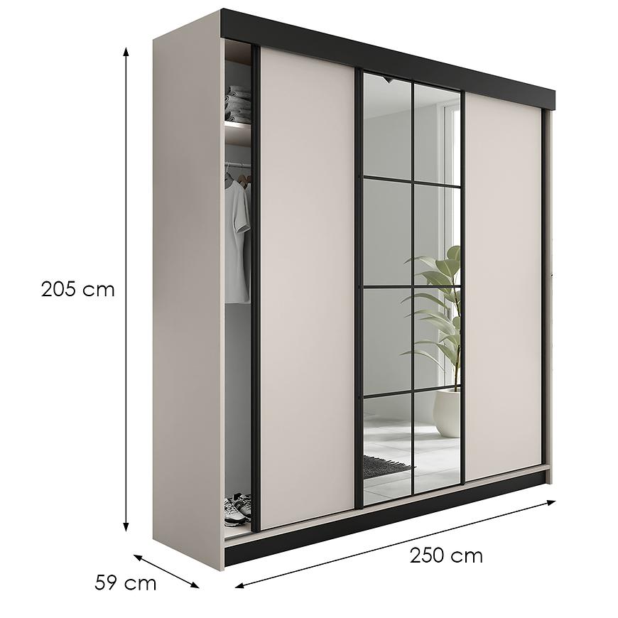 Dzięki szerokości 250 cm i trzydrzwiowemu systemowi przesuwnemu, szafa oferuje dużą przestrzeń do organizacji ubrań, obuwia i dodatków, jednocześnie umożliwiając swobodny dostęp bez konieczności otwierania drzwi na zewnątrz. Duże lustro umieszczone na froncie nie tylko podnosi funkcjonalność mebla, ale także wizualnie powiększa i rozjaśnia wnętrze, co jest szczególnie ważne w mniejszych pomieszczeniach.