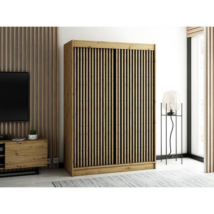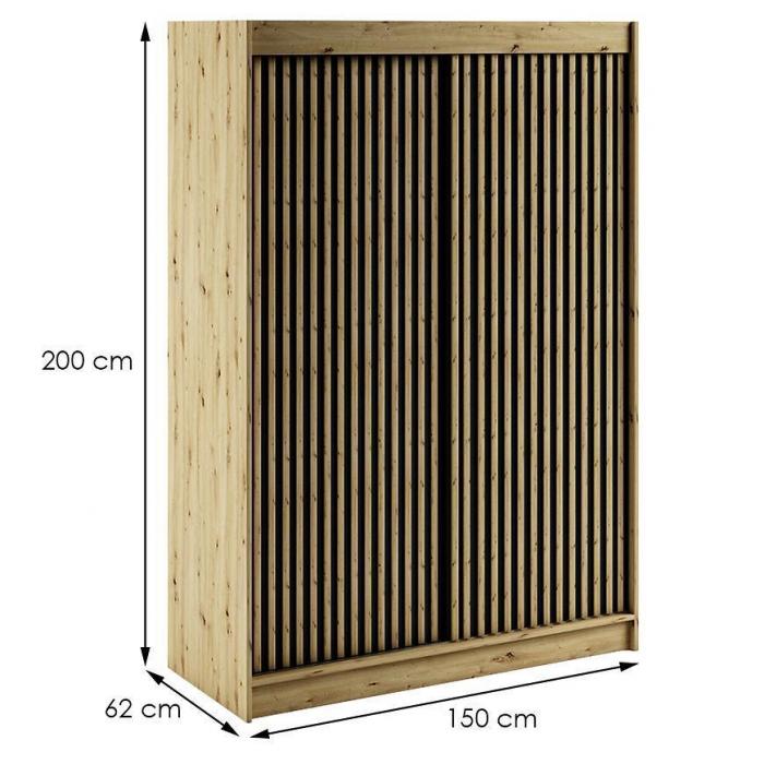 Szafa z przesuwanymi drzwiami w kolorze czarny/dąb artisan z kolekcji Lamelo to doskonała propozycja do pokoju dziennego, ale znajdzie swoje miejsce również w innym pomieszczeniu, jak na przykład w przedpokoju czy garderobie, sypialni. Wygląd szafy sprawi, że wpasuje się w większość aranżacji. Szafa będzie świetnym miejscem do wieszania ubrań. Materiał wykonania to płyta laminowana. Możliwość dokupienia szuflad.
