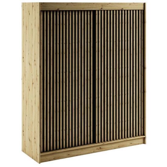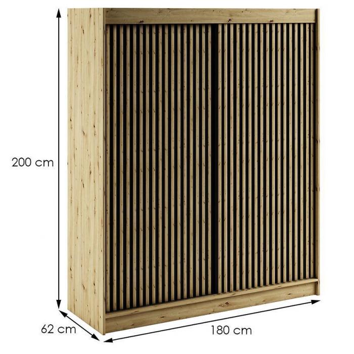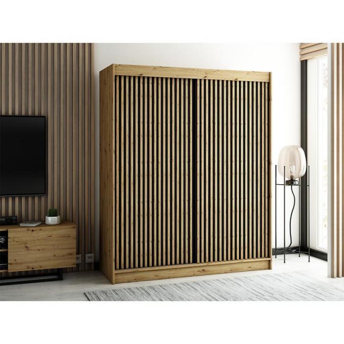 Szafa z przesuwanymi drzwiami w kolorze czarny/dąb artisan z kolekcji Lamelo to doskonała propozycja do pokoju dziennego, ale znajdzie swoje miejsce również w innym pomieszczeniu, jak na przykład w przedpokoju czy garderobie, sypialni. Wygląd szafy sprawi, że wpasuje się w większość aranżacji. Szafa będzie świetnym miejscem do wieszania ubrań. Materiał wykonania to płyta laminowana. Możliwość dokupienia szuflad.
