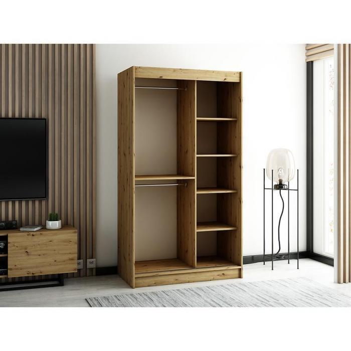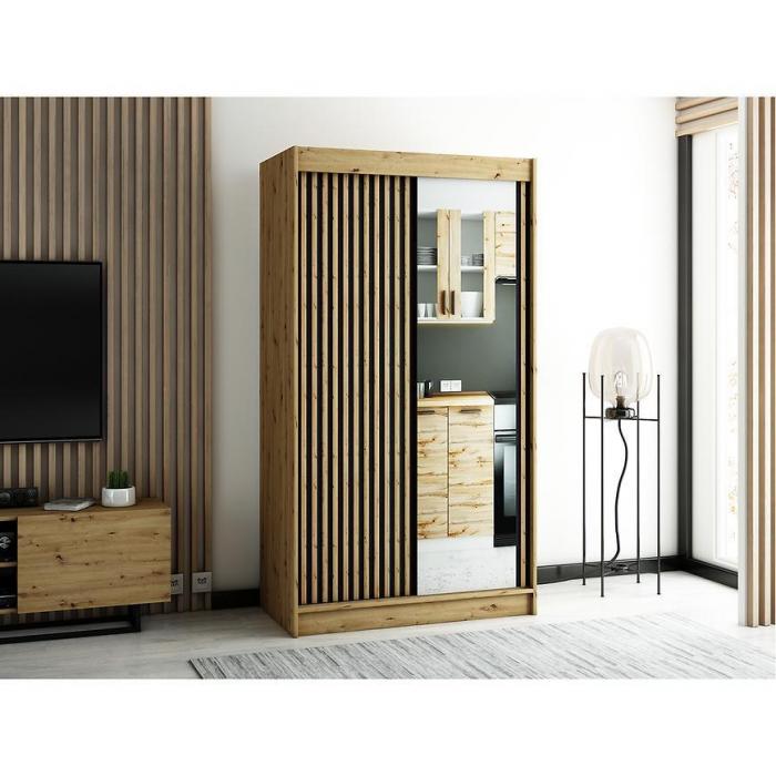 Szafa z przesuwanymi drzwiami w kolorze czarny/dąb artisan z kolekcji Lamelo to doskonała propozycja do pokoju dziennego, ale znajdzie swoje miejsce również w innym pomieszczeniu, jak na przykład w przedpokoju czy garderobie, sypialni. Pojemna szafa Lamelo posiada lustro, które sprawi, że pomieszczenie stanie się optycznie większe. Wygląd szafy sprawi, że wpasuje się w większość aranżacji. Szafa będzie świetnym miejscem do wieszania ubrań. Materiał wykonania to płyta laminowana. Możliwość dokupienia szuflad.