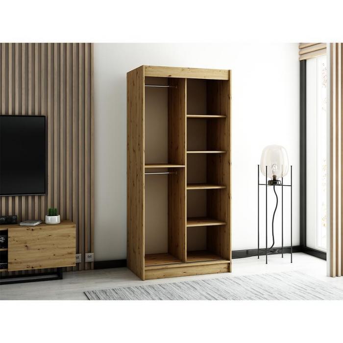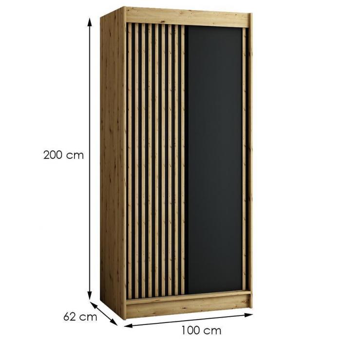 Szafa z przesuwanymi drzwiami w kolorze czarny/dąb artisan z kolekcji Lamelo to doskonała propozycja do pokoju dziennego, ale znajdzie swoje miejsce również w innym pomieszczeniu, jak na przykład w przedpokoju czy garderobie, sypialni. Wygląd szafy sprawi, że wpasuje się w większość aranżacji. Szafa będzie świetnym miejscem do wieszania ubrań. Materiał wykonania to płyta laminowana. Możliwość dokupienia szuflad.